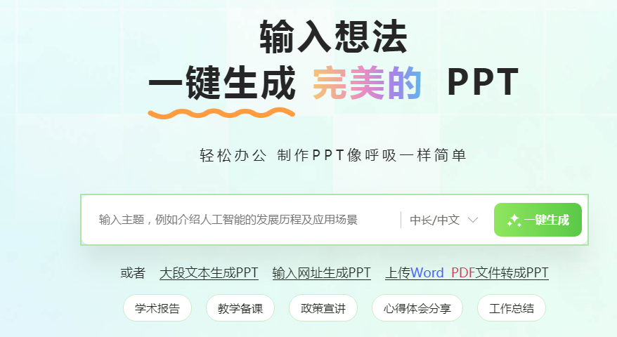 在数字化完全普及的时代中,人们的工作和学习等各个领域采用ai技术,可提升我们的工作效率。尤其在职场中,都需要经常制作高质量的ppt幻灯片,将工作内容以及未来趋势走向展现的特别清晰。ai做ppt一键生成软件有哪些?高质量以及先进的ppt一键生成软件可帮助人们告别千篇一律的模板,创作出来的作品逻辑清晰,结构明了。您跟随小编共同看看以下这些生成ppt的软件吧。