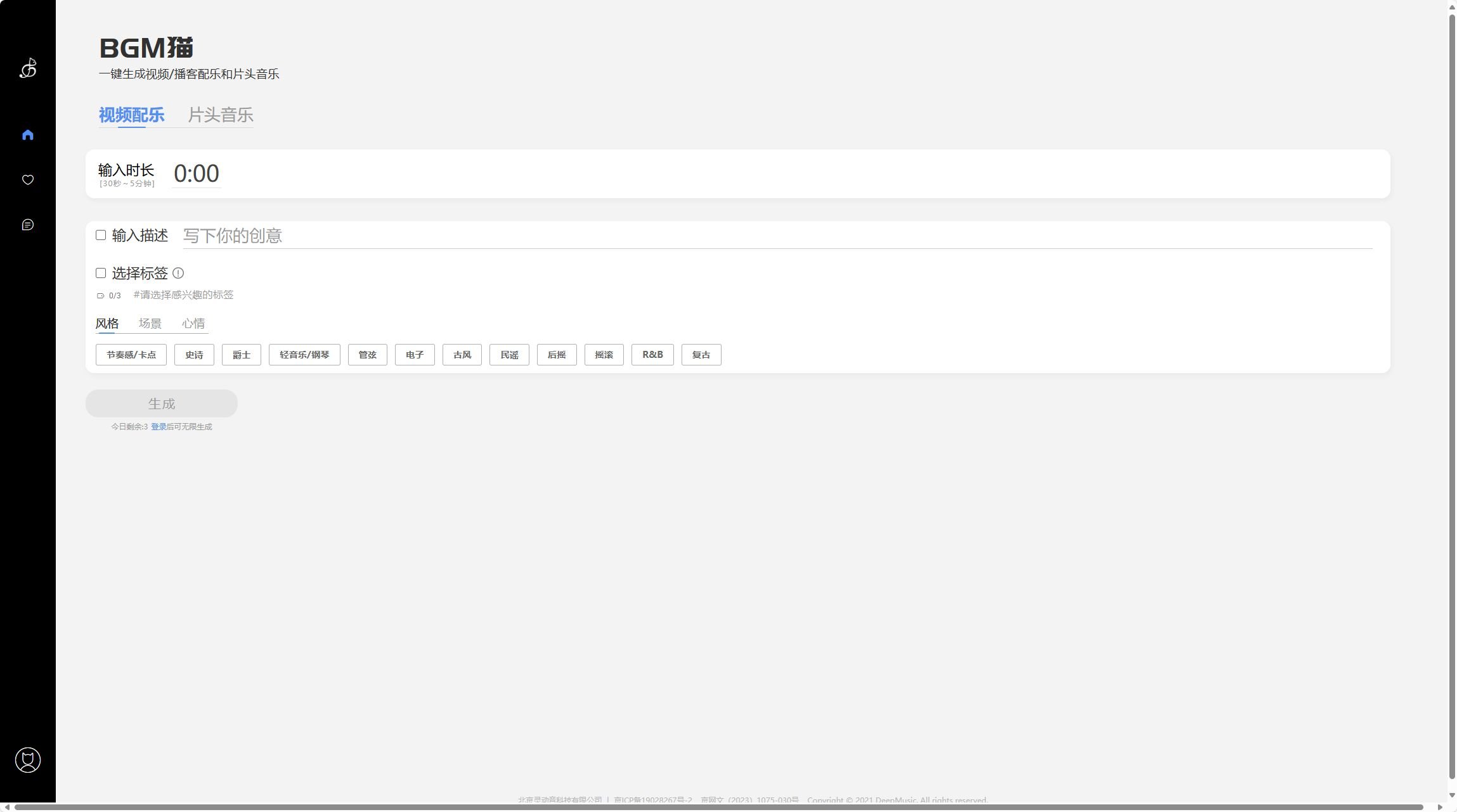 这是一款专注背景音乐生成的工具,用户可以选择不同的生成时长,主要在30秒到300秒以内,还可以选择不同的音乐风格标签,例如,紧张、治愈等,当然了,在使用的时候也不用担心版权纠纷,AI会帮助用户自动匹配风格并生成免版税的BGM,适合用于短视频创作以及博客等场景,支持情绪与场景的精准适配,操作十分简单,新手也能快速上手。