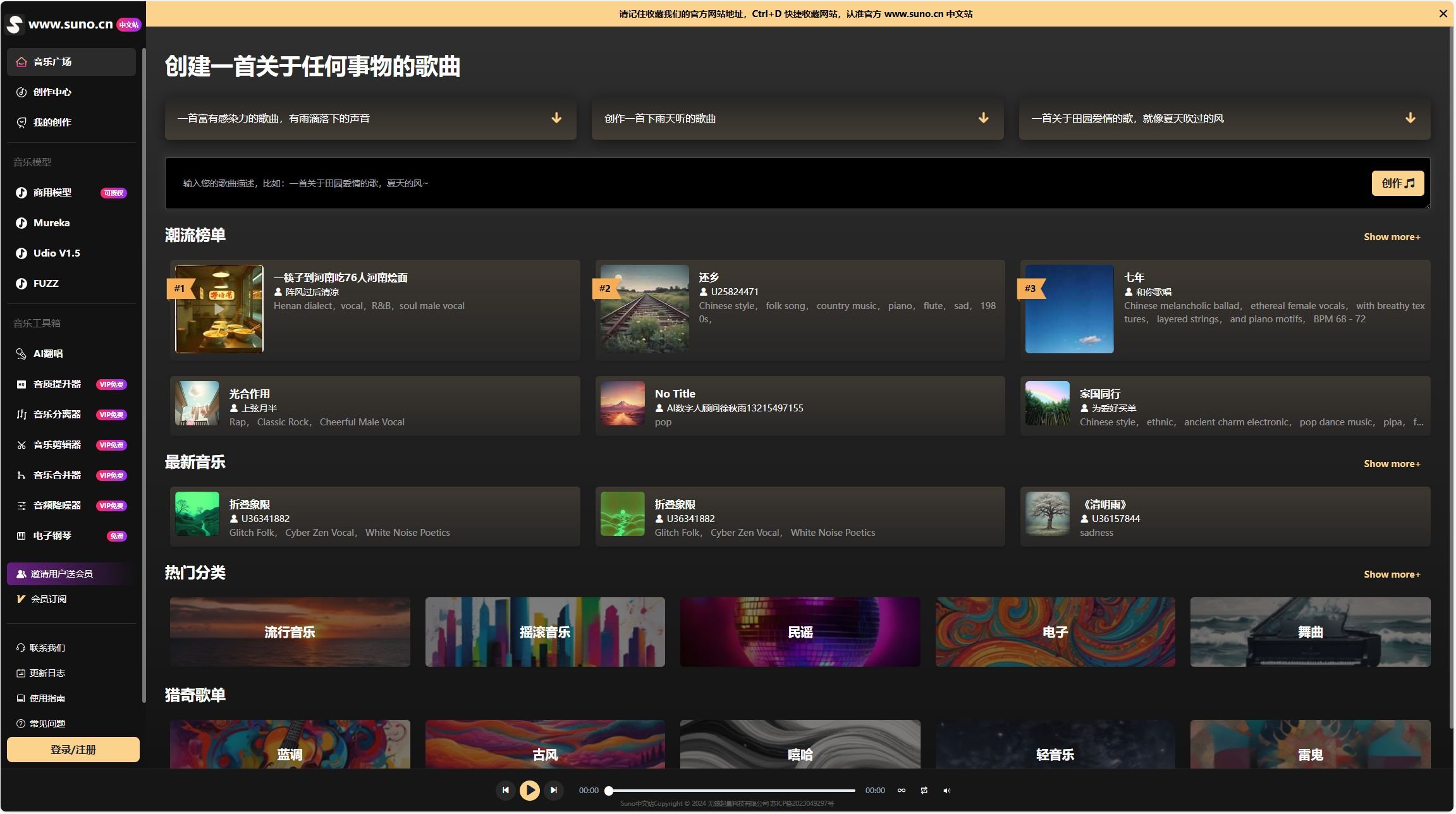 这是一款免费的AI音乐平台,支持根据歌词或音乐风格生成原创歌曲。用户可在线试听并调整旋律、节奏和乐器搭配,生成的作品也可直接用于视频配乐或商业用途,不用担心版权争议。界面简洁易用,提供海量模板和实时预览功能,很适合一些个人创作者用于快速制作个性化音乐,没有录音室,也可以做出自己的音乐作品。
