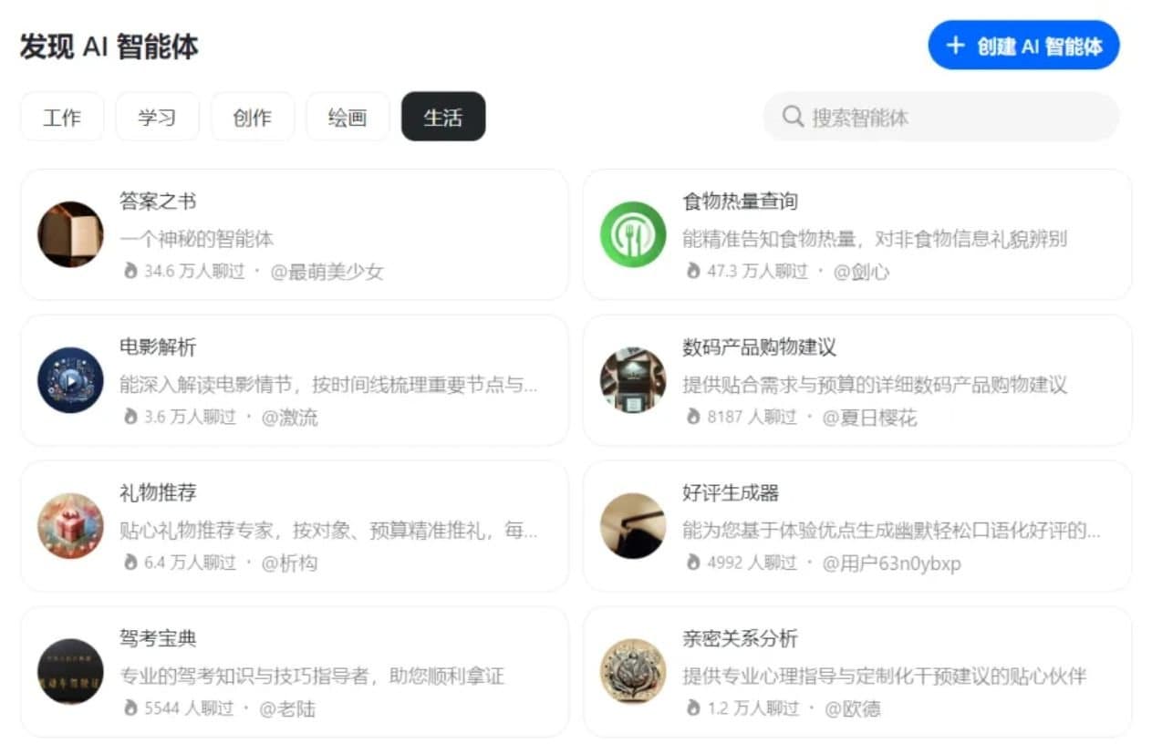 豆包:更注重娱乐化和生活化,拥有大量定制化智能体,适合日常聊天、趣味互动以及简单的任务处理。它的设计更贴近普通用户,操作简单,适合轻松愉快的使用场景。