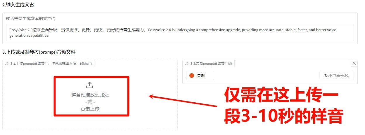 1、cosyvoice的操作界面更简洁,并没有传统的模型训练功能,仅需提供3-10秒的参考音频就能完成一段相似度极高的声音复刻,而GPT-SoVITS需要进行模型训练后才能得到相似度更高的克隆音,操作繁琐。