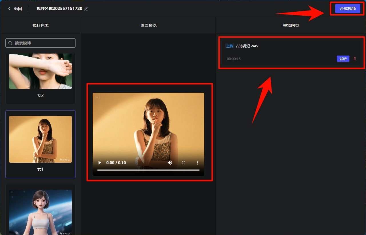 3.手背遮住嘴唇最后手臂放下,我们继续上面操作,上传相同音频文件,并点击合成视频。