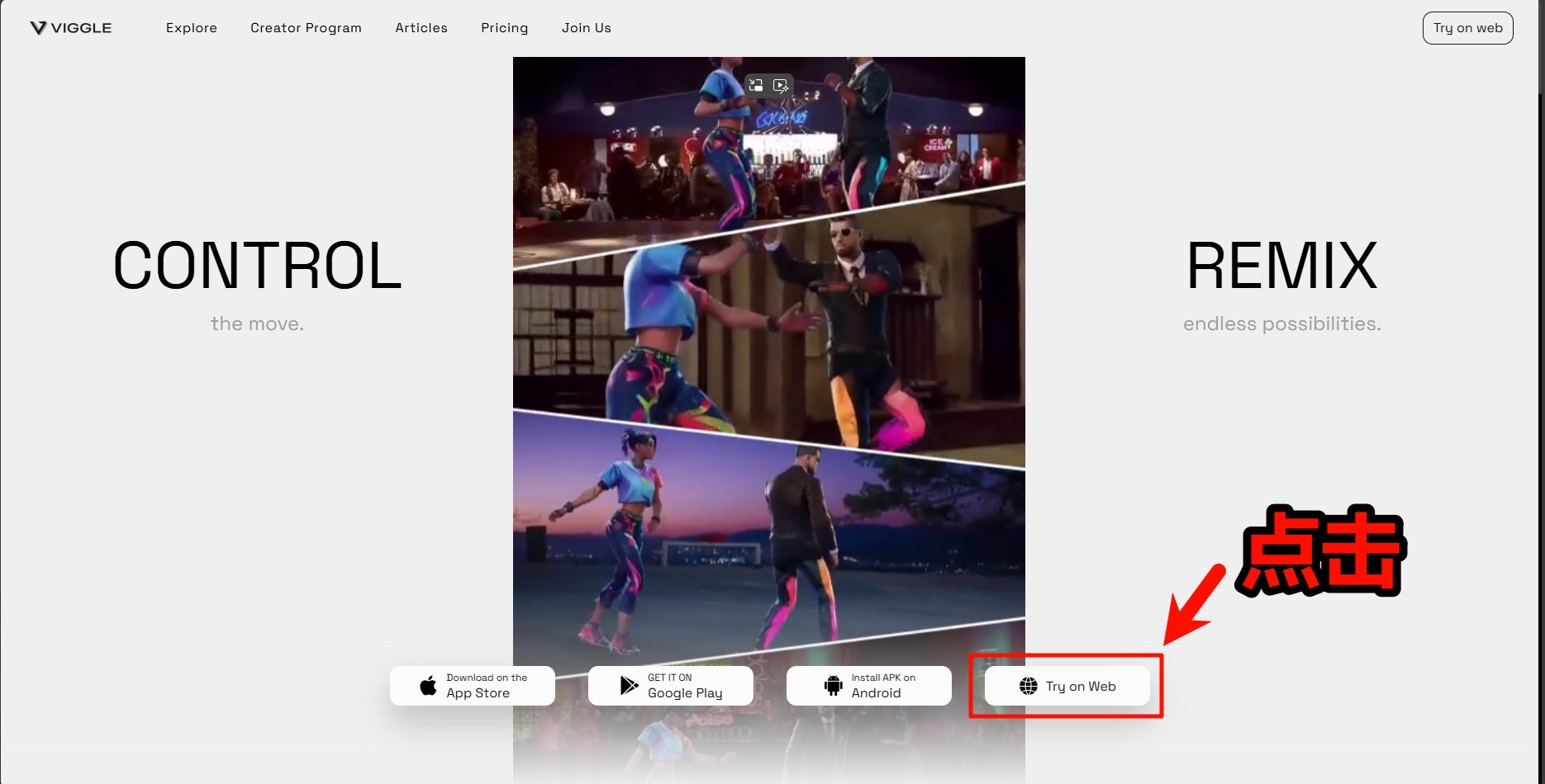 点击viggle AI动作替换软件,点击最后一栏Try on Web,页面跳转登录。
