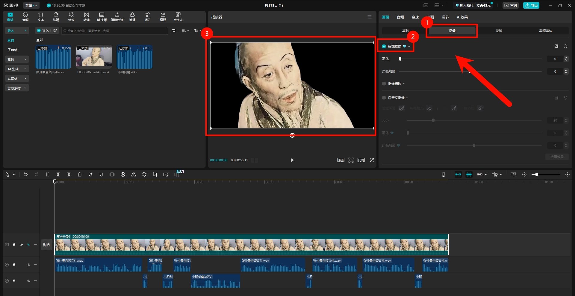 3.第三步,点击画面视频选择抠像,点击智能抠像,可以看到人物背景抠出。