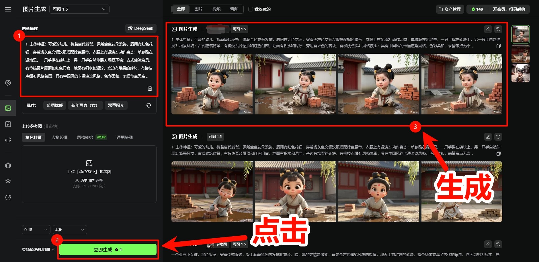 进入生成页面后,在创意描述框粘贴提示词,点击【立即生成】按钮,稍等片刻即可在右侧预览区查看生成效果,选择满意的图片点击下载保存。