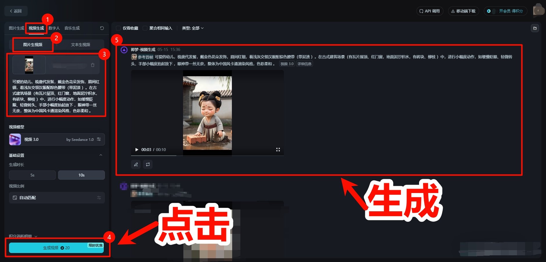 进入视频生成界面,选择【图片生成视频】功能,上传裁剪后图片并输入提示词,点击生成按钮后,在右侧预览区等待几分钟即可完成视频生成,最后下载保存作品。