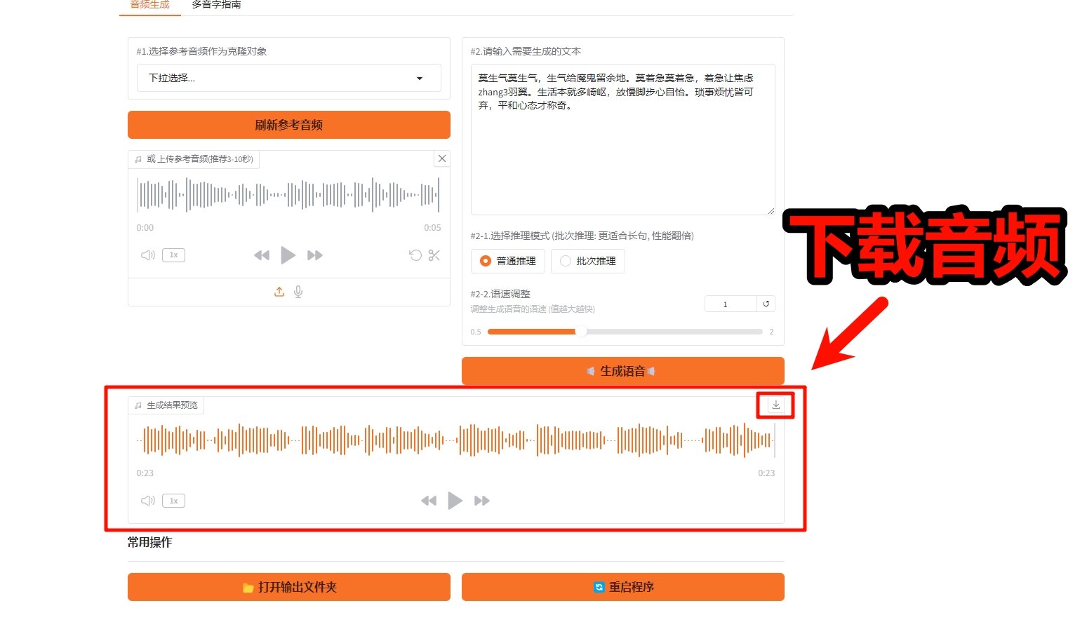使用IndexTTS克隆软件将合适的音频截取一段几秒文件上传,进行语音克隆,导入写好的文案,用克隆的音色生成配音;并下载保存。