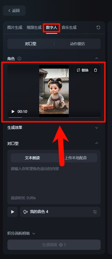 继续点击第三栏【数字人】;在下方角色栏中上传制作好的视频。