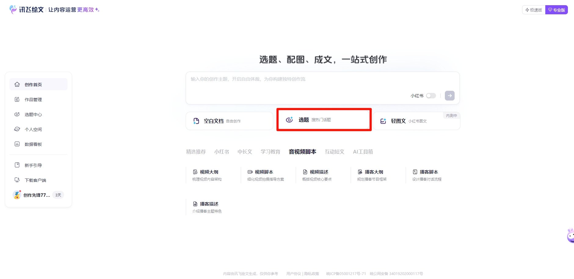 目前讯飞绘文支持多种不同领域的文案编写,例如,中长文;音视频脚本编写;互动性短文等只需输入你的灵感关键词,AI就能自动扩写丰富细节,提供多种风格改写,生成优质选题方向。