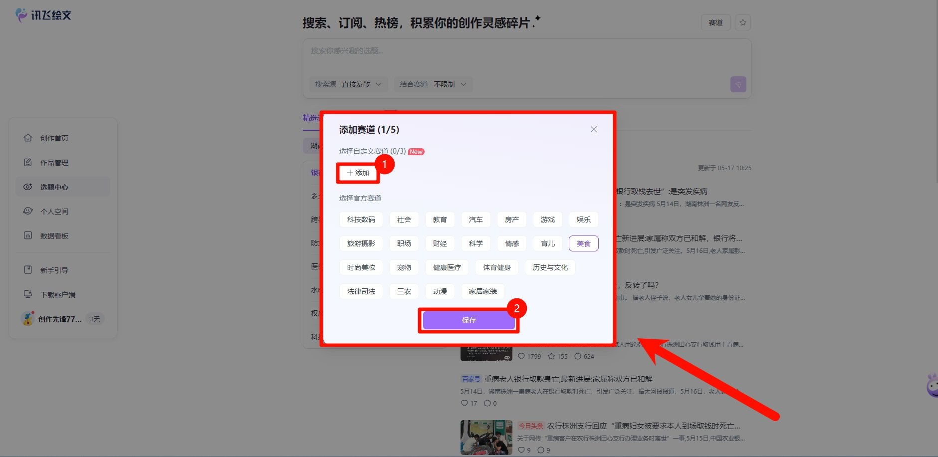 生成话题赛道后,将显示在文本框下方。点击选择(如‘美食’赛道),即可展示出现。