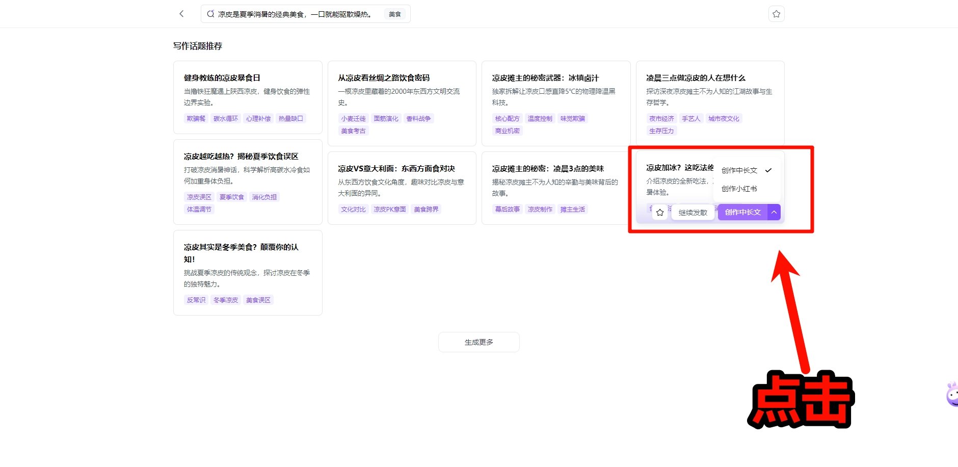 选择任意写作话题后,在选项菜单中可见(创作小红书短文)和(创作中长篇文章)。选择【创作中长文】选项为例。
