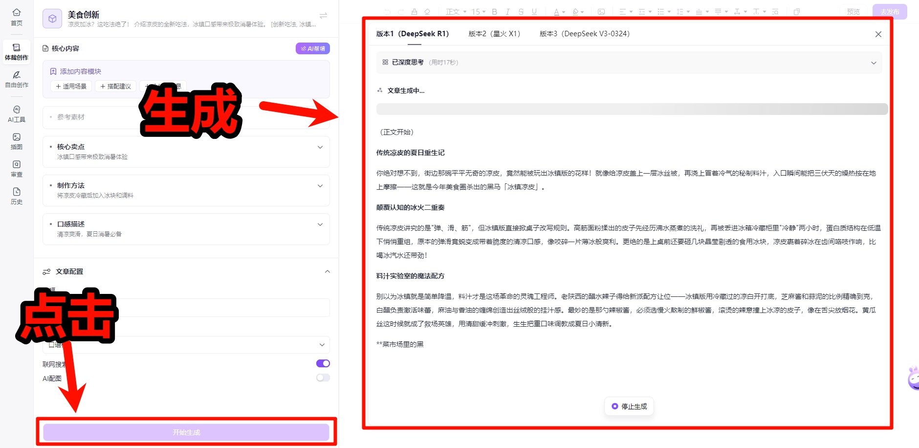 点击生成按钮后,右侧将显示AI生成内容,提供三个版本可选(DeepSeek R1)、(星火 X1)、(DeepSeek V3-0324)。