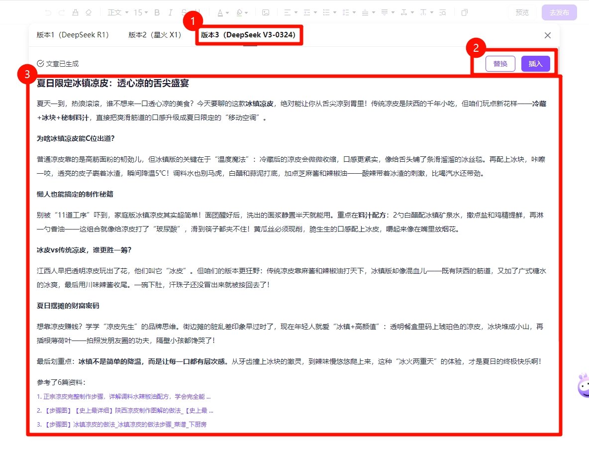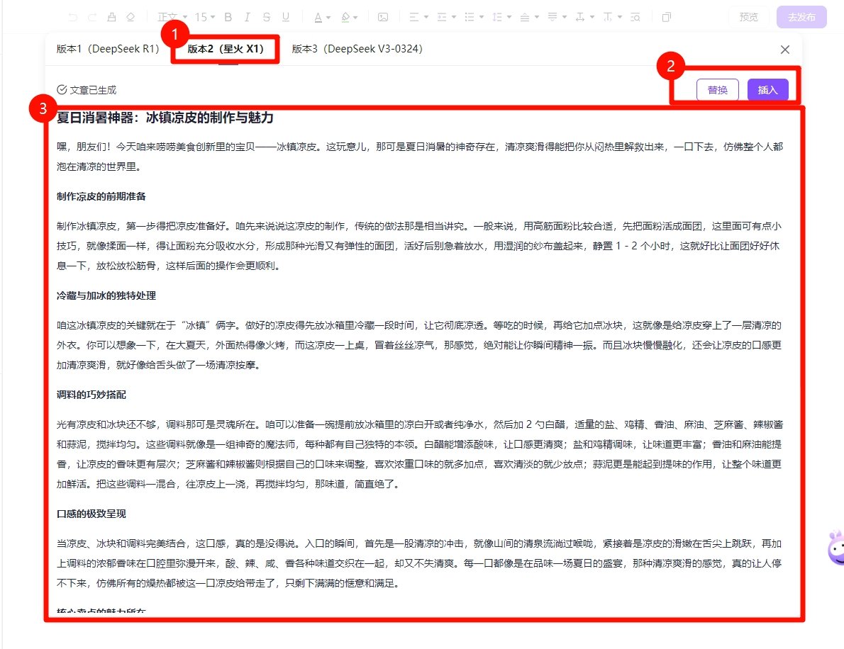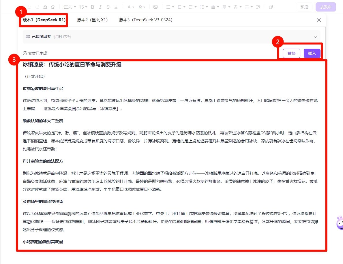 完成选择后点击【插入编辑器】,即可查看完整文本内容。下方展示三个AI版本的生成结果,供大家自由浏览比较。