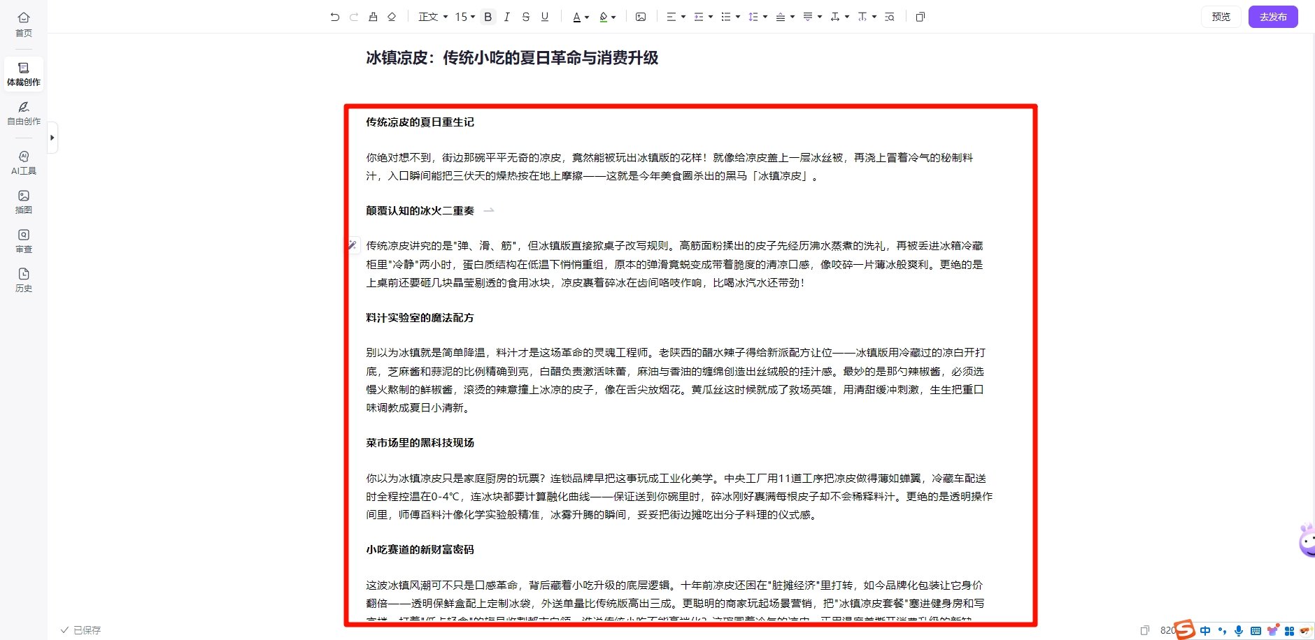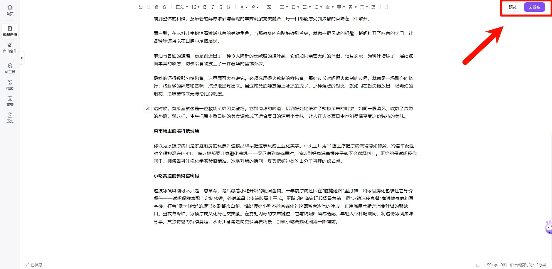 页面跳转后,系统已自动生成左侧核心内容区及完整的文章配置方案。