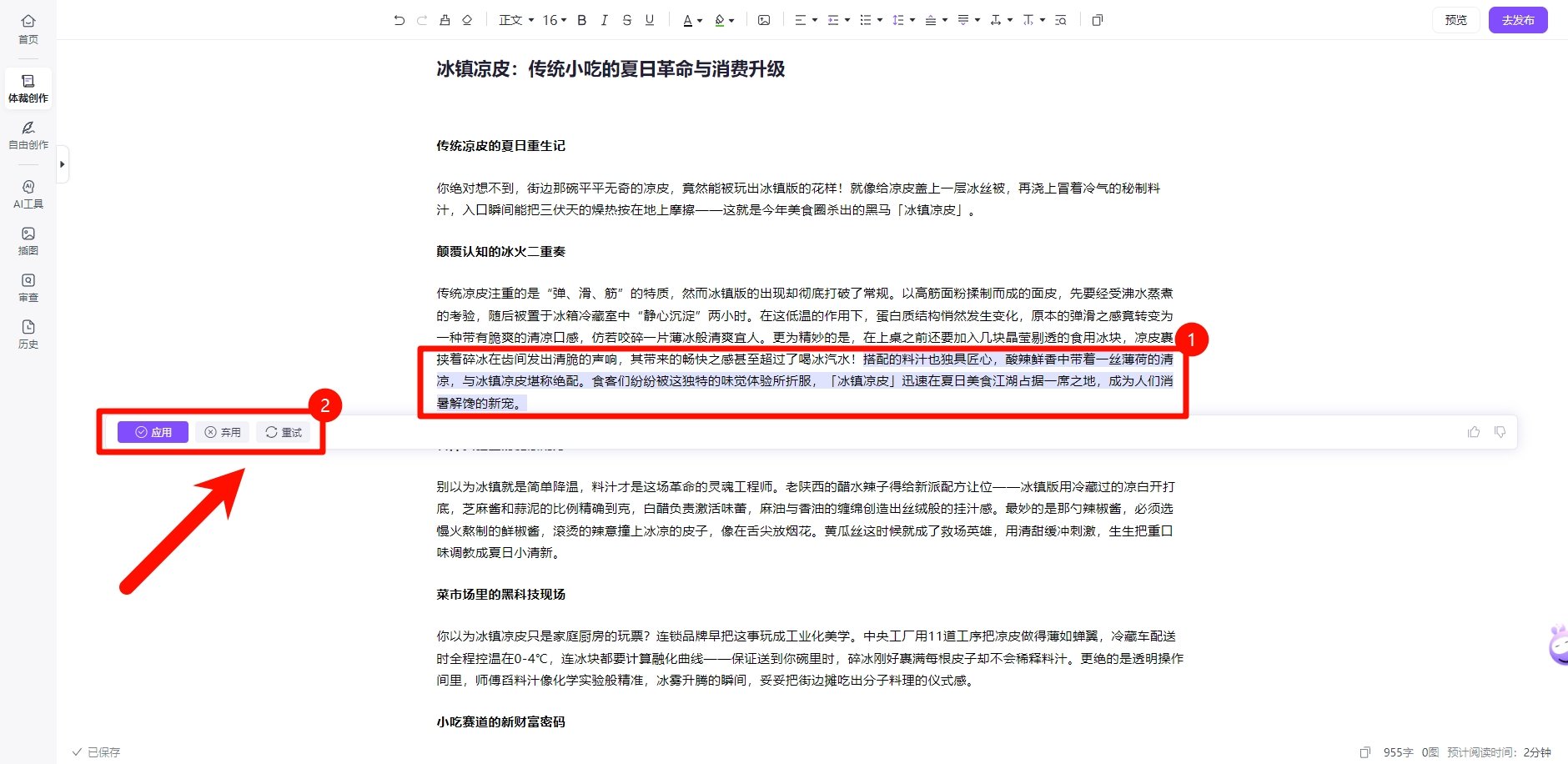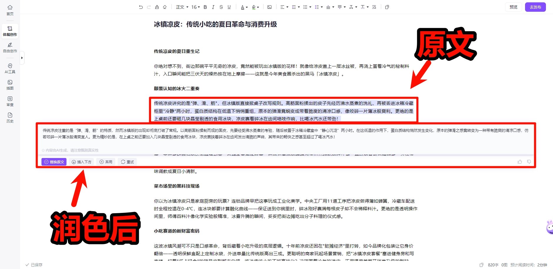 当段落内容需要优化时,选中目标段落 → 点击”润色”;系统生成优化版本(白色文本框展示),标注处显示修改内容。