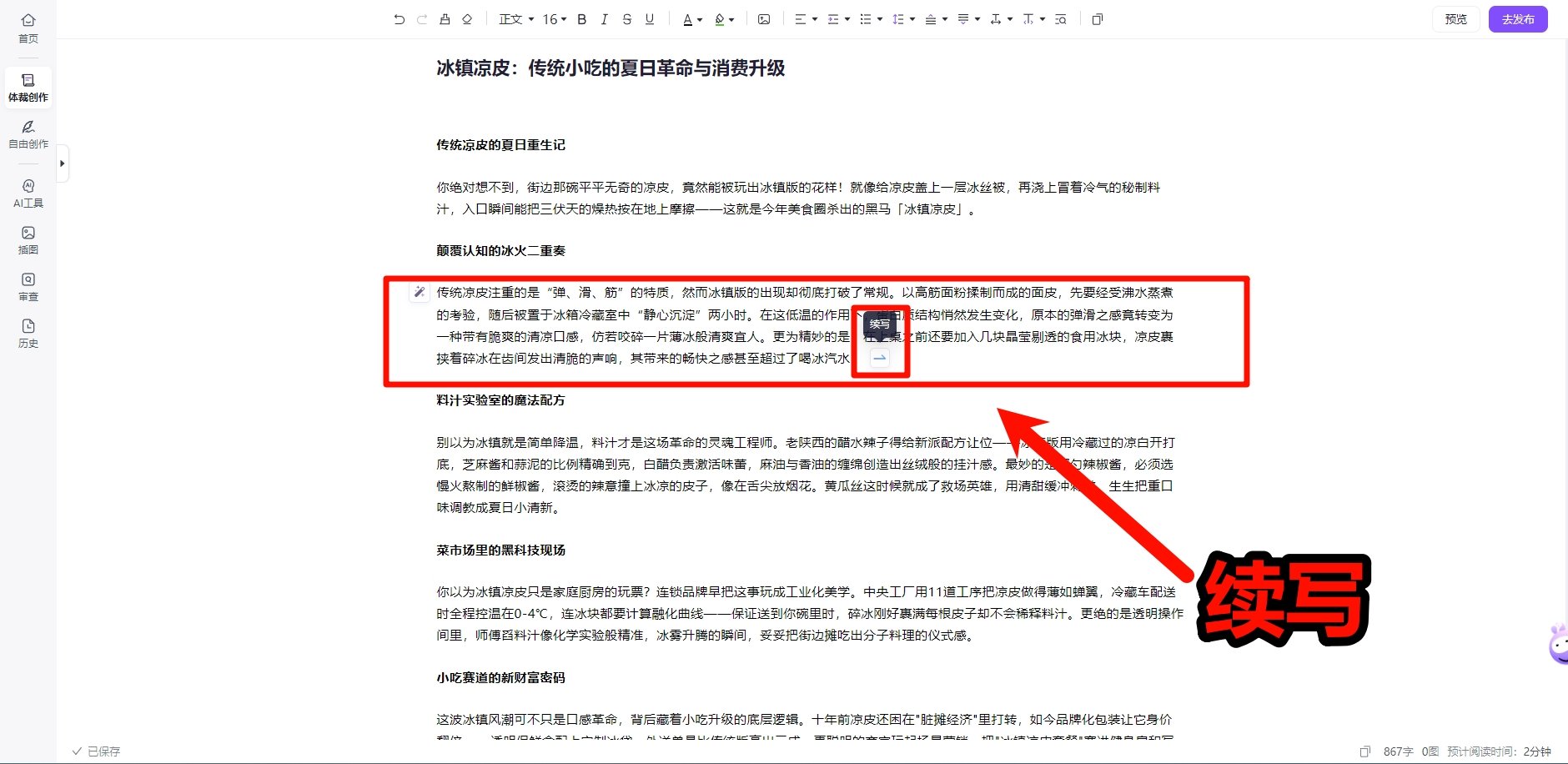 想让内容更饱满两种方式开启续写,可以点击段落旁的魔法棒选择【续写】,或者直接点击段尾的箭头标志AI会帮您自然延伸段落内容。