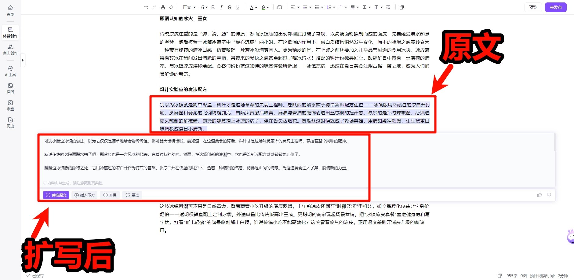 选中需要扩展的文本段落,点击【扩写】按钮。