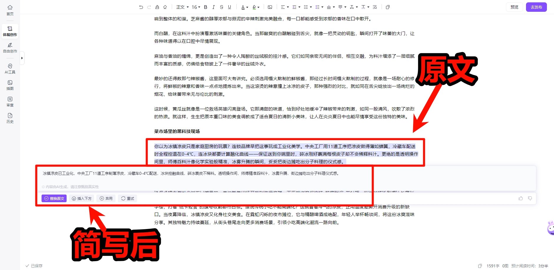 选中目标段落,点击【简写】功能键;系统将自动删除冗余修饰语,合并重复表达,优化句子结构。下方白色文本框就是生成内容。