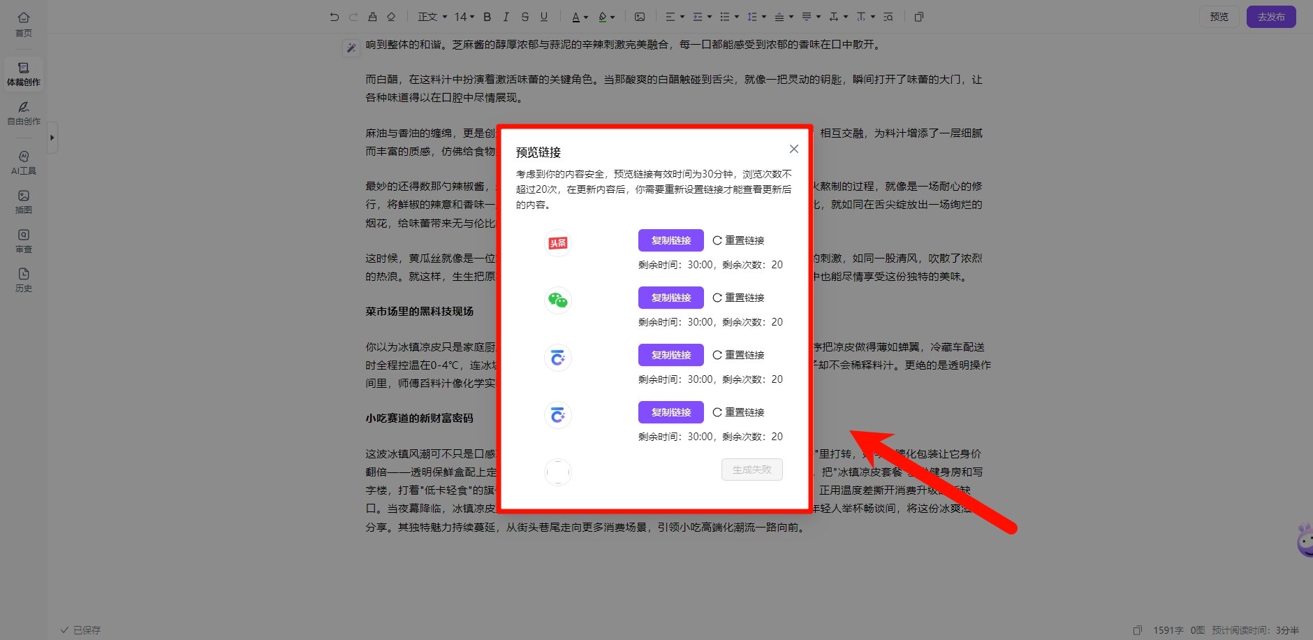 觉得AI对文章修改很完善时,右上角预览按键点击跳转页面后,可以给不同平台以链接形式分享AI修改后的话题文章。