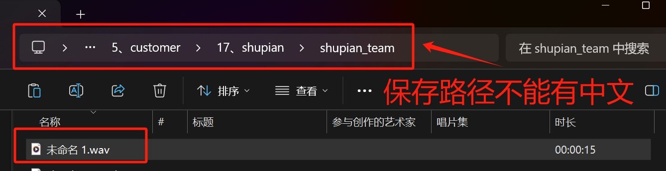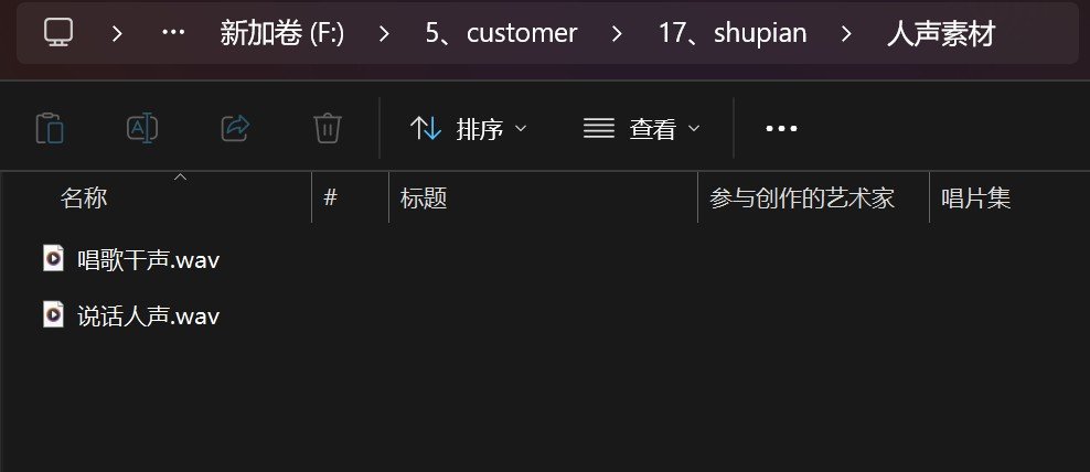 首先我们新建一个目录,将不低于10分钟的说话音频和十首清唱音频存放进,如果想要用于训练则需要将音频都切成15秒以内的小段。