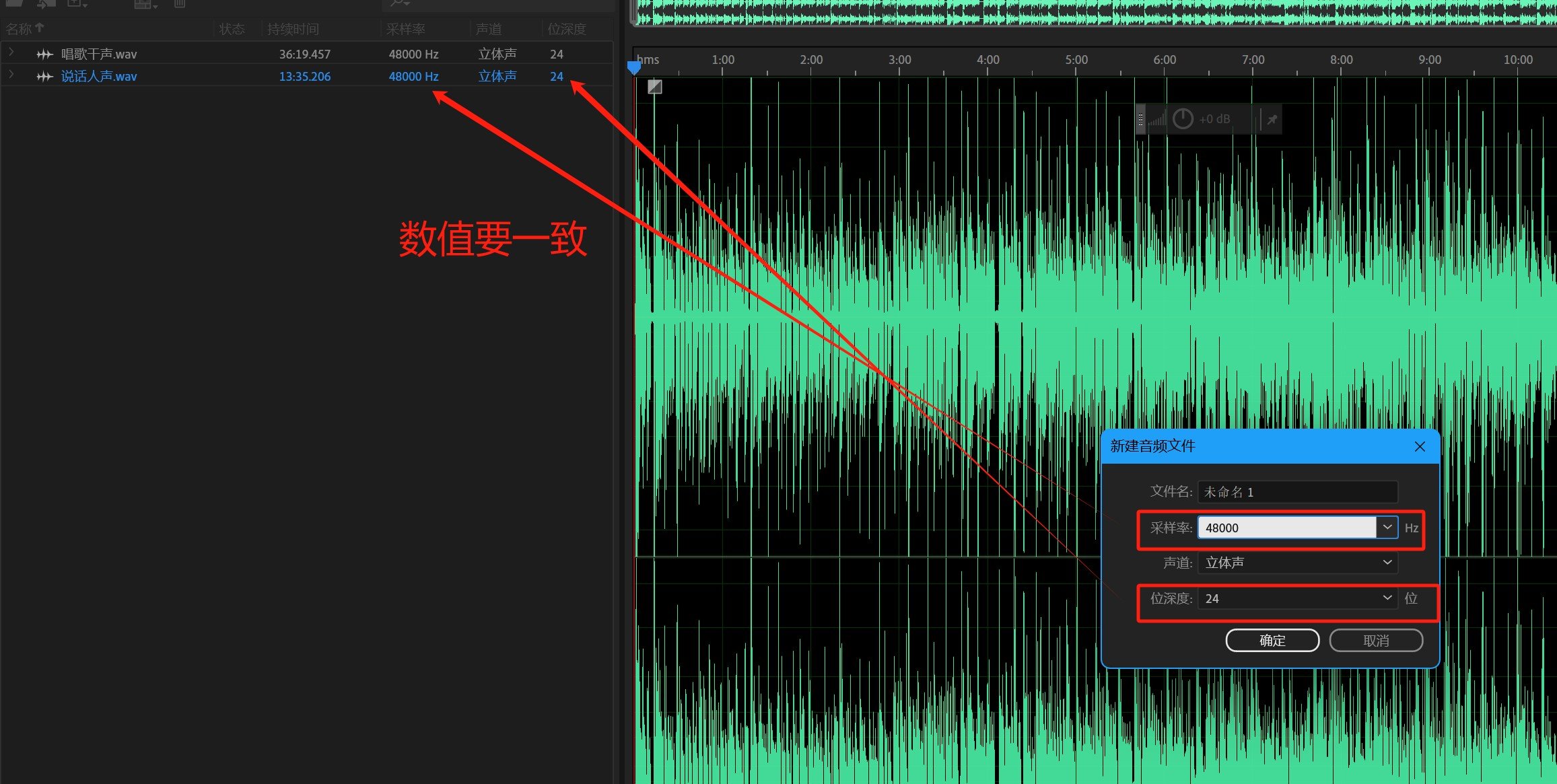 之后键盘按住Ctrl+shift+n,就会蹦出【新建音频文件】界面,将采样率调到与音频采样率是一样,位深度也一样。