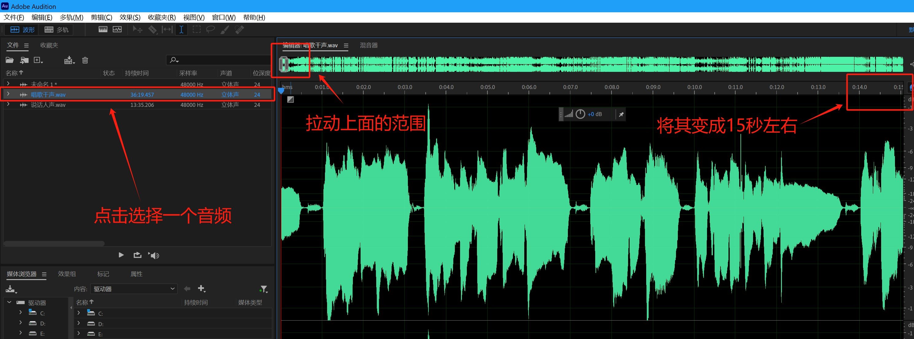 之后找到有声音的地方,并以15秒为一段,然后点击Ctrl加x键把声音剪切,再Ctrl加v粘贴到未命名文件里,记住我们模型训练参考音频质量一定要高,不要是那种很垃圾的,或者说背景杂音很多的,一定要是处理好的,没有什么伴奏,且为纯人声的那种音频。