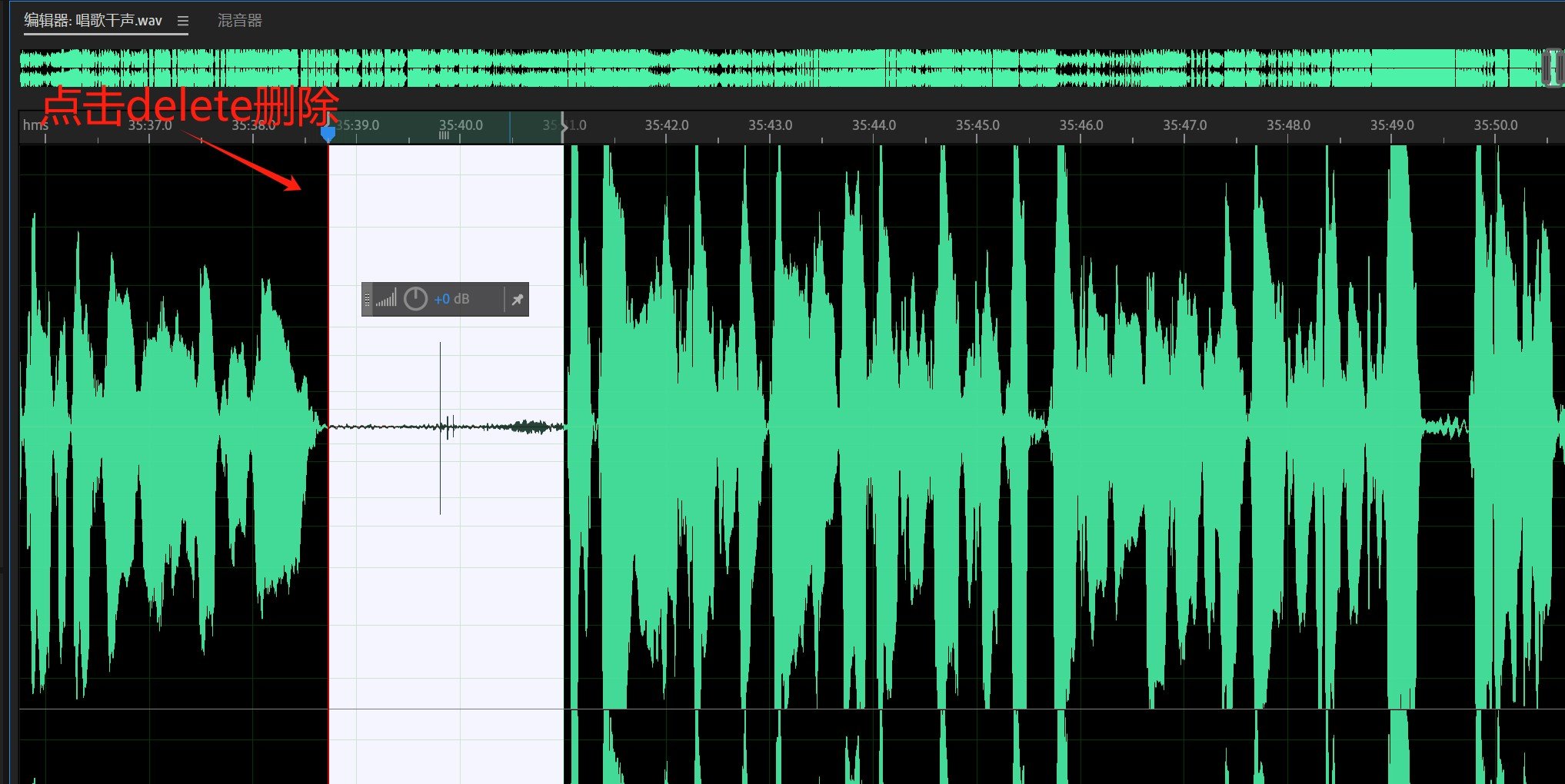 我们需要把这种没有声音的地方去除,至于如何去除呢,那就需要选中要删除的位置,而后按键盘上的【DELETE】这个键,一按它就删除了。