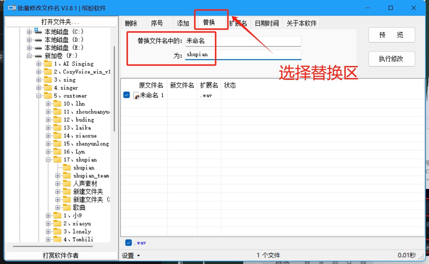 我们就要点开,批量修改文件名工具,而后找到,刚才我们保存的文件,选择【替换】区,并将文件中的中文替换成英文或者数字,并点击【预览】,而后选择【执行修改】,那么这些音频最后处理的步骤就做完了。