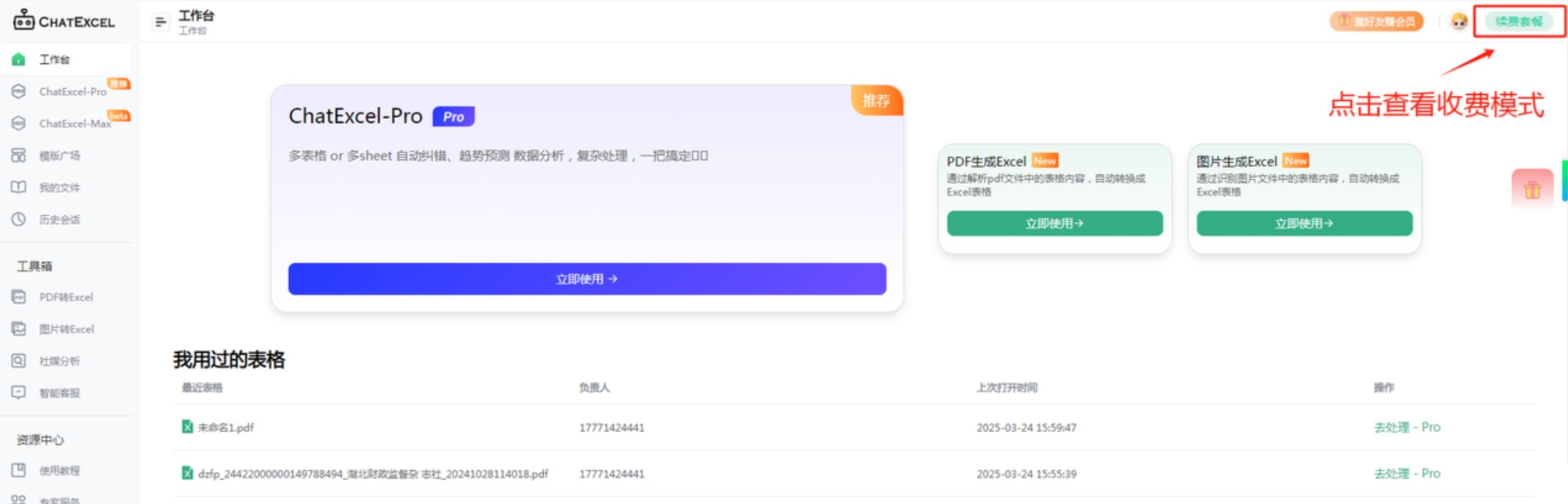 在酷表的主界面,你可以看到各种功能选项。要使用自动生成表格的功能,首先需要点击“ChatExcel-Pro”这一选项。酷表提供了不同类型的AI工具,可以帮助用户自动化完成各种表格任务。