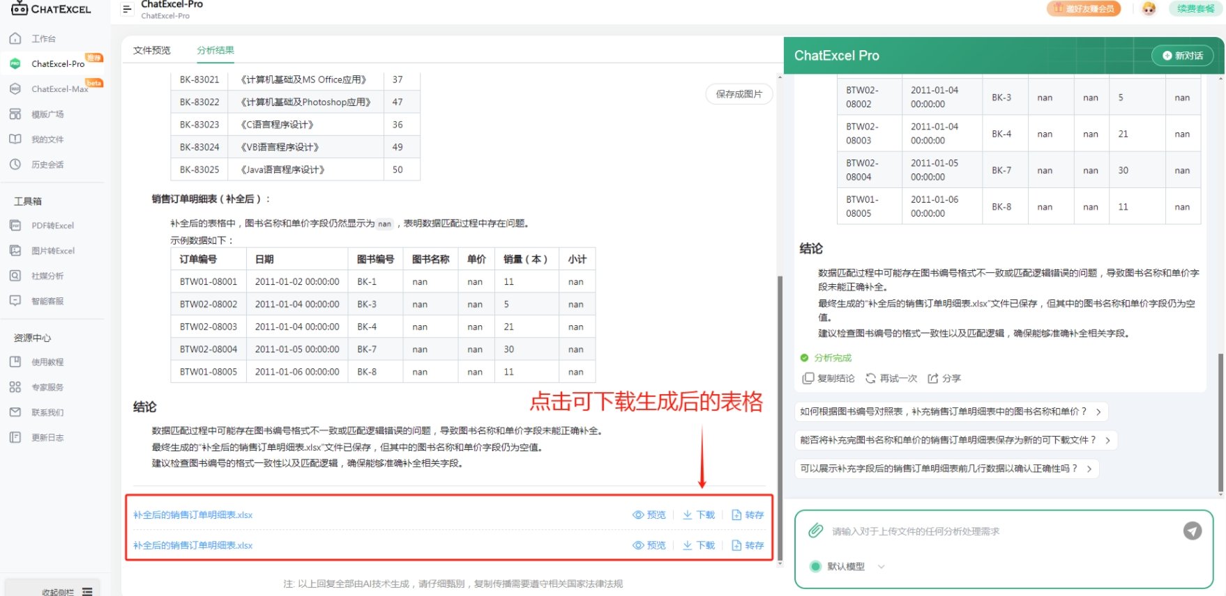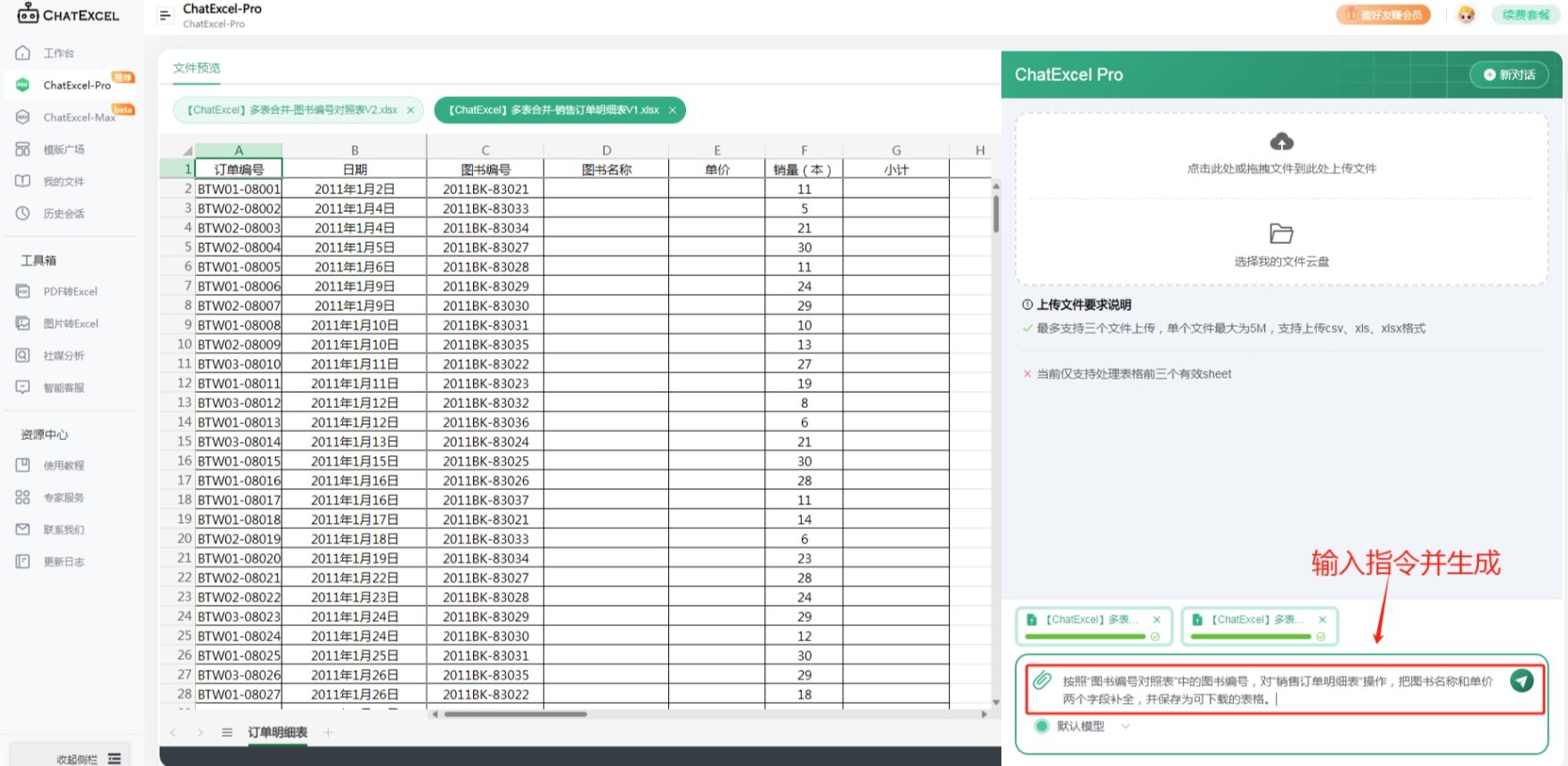 导入的表格将出现在你的酷表工作区中,此时你只需要输入想生成的表格需求,让AI自动生成表格即可。以下图为例,如果想将“图书编号对照表”中的字段根据“销售订单明细表”补充完整,就可以输入按照“图书编号对照表”中的图书编号,对”销售订单明细表“操作,把图书名称和单价两个字段补全,并保存为可下载的表格。