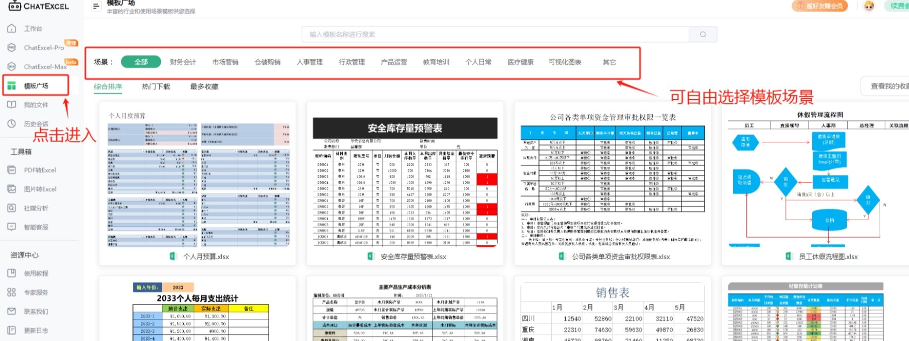 点击主界面左侧的“模板广场”选项,在模板库页面,酷表根据不同的用途和类别将模板进行了分类,用户可以根据自己的需求选择相应的模板类别。