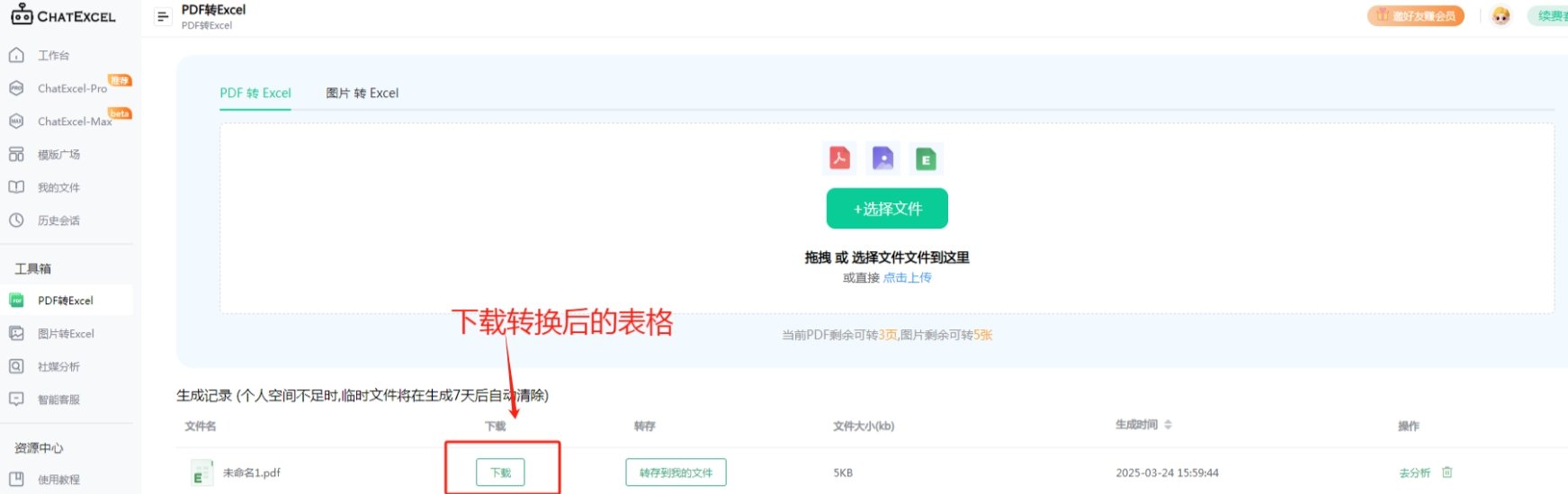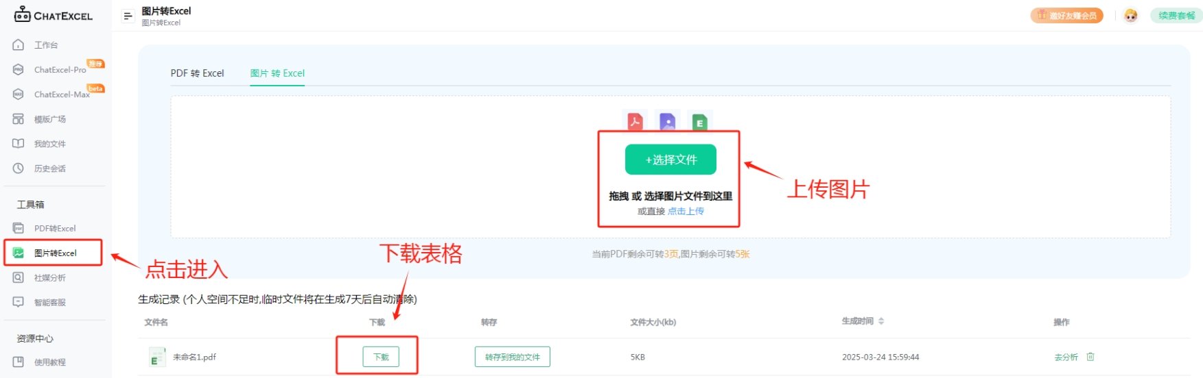 如需将图片转为表格,也采用以上的方法,将图片上传,最后在生成记录里将转换后的表格进行下载即可。