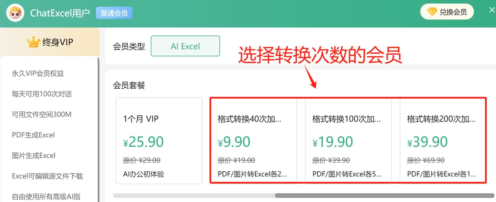 如果你只是偶尔使用格式转换这个功能,可以往后划动,只开通转换次数,分为40次、100次、200次,价格分别是9.9/19.9/39.9。