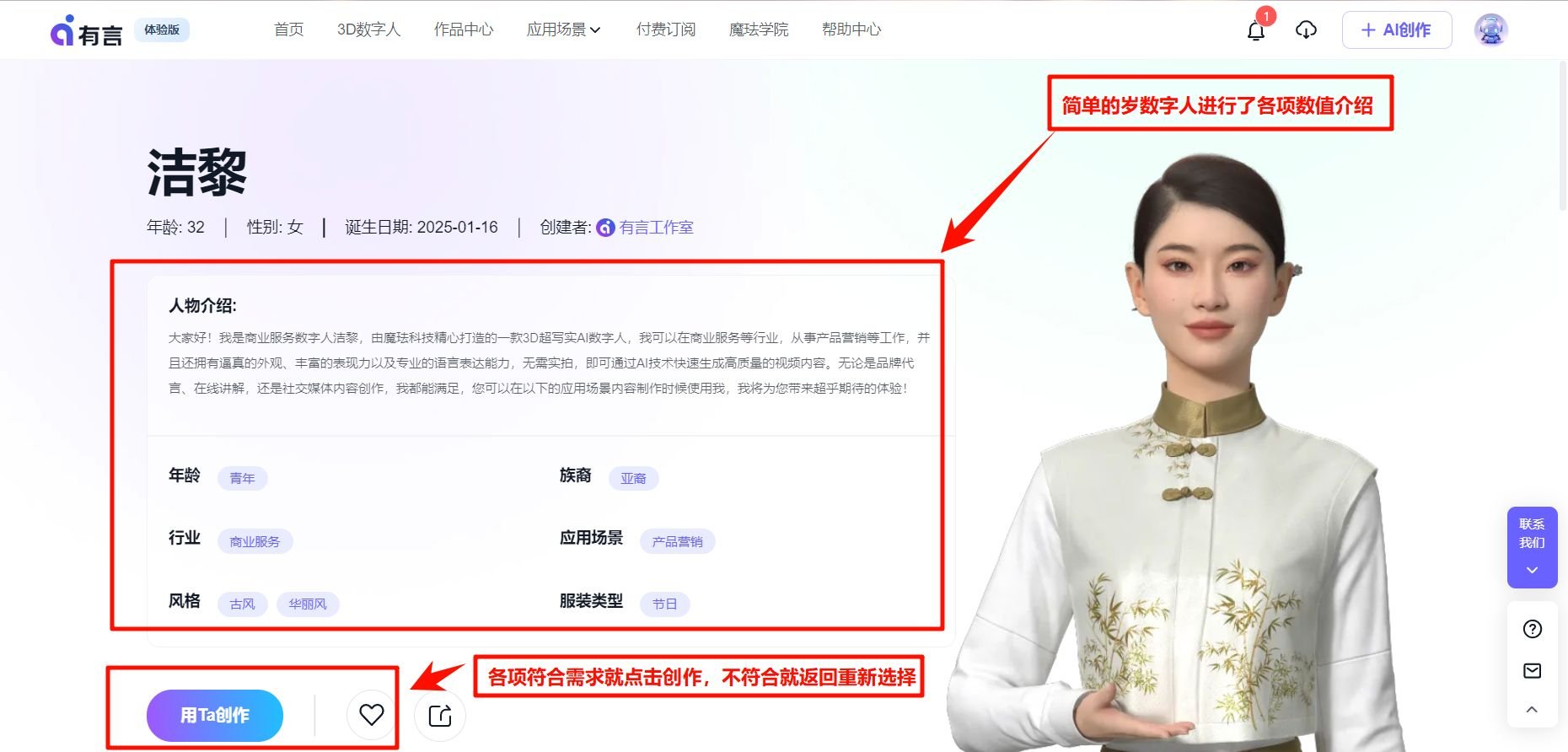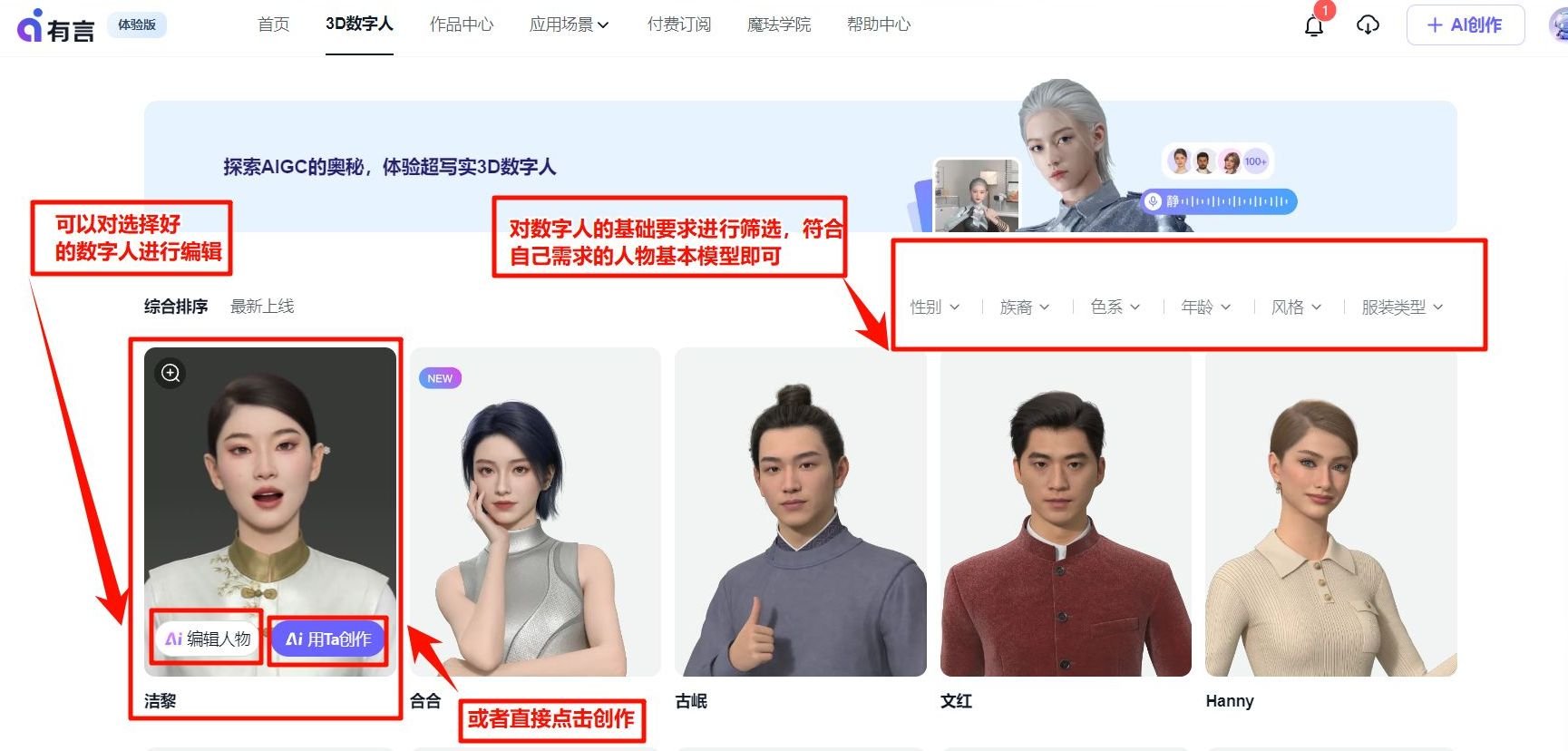 跳转到如下图,选择一个符合总结审美和数字人要求的人物模型。可以对数字人进行初步的筛选,基本模型选择完毕之后可以对数字人进行细节调整或者是直接使用创作。