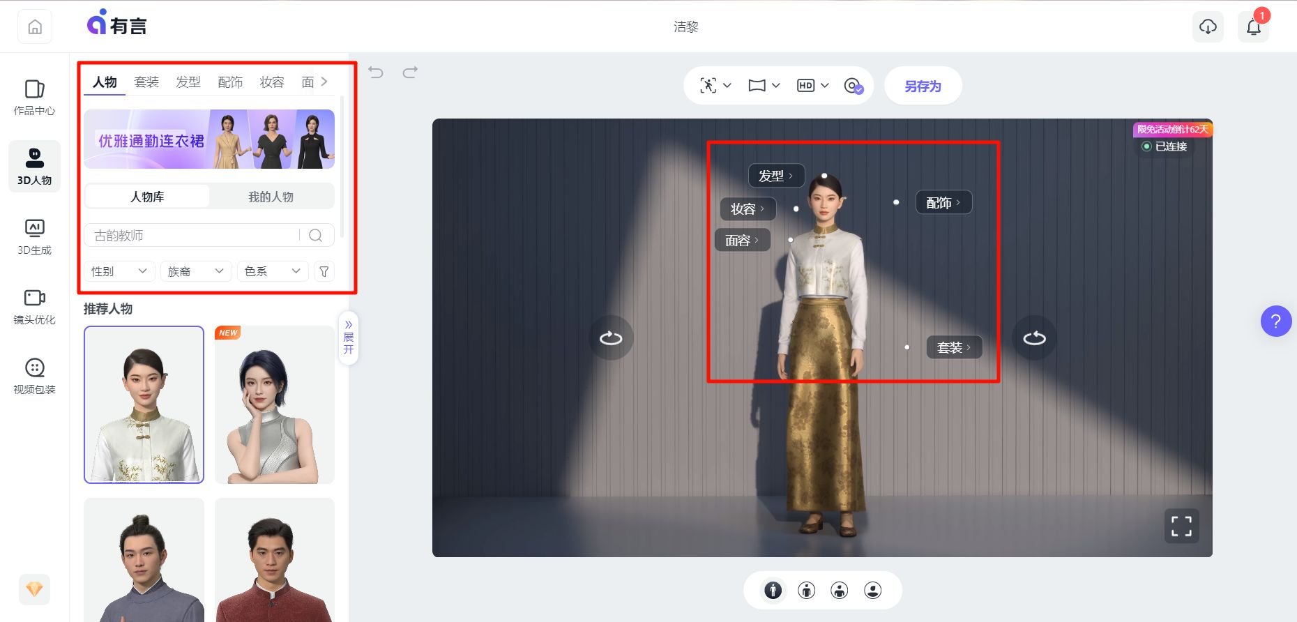 点击创作,用户跳转到以下页面,就可以对人物进行配饰、面容妆容、服饰和发型进行调整,对比直接使用数字人创作多了一些个性化的设置。