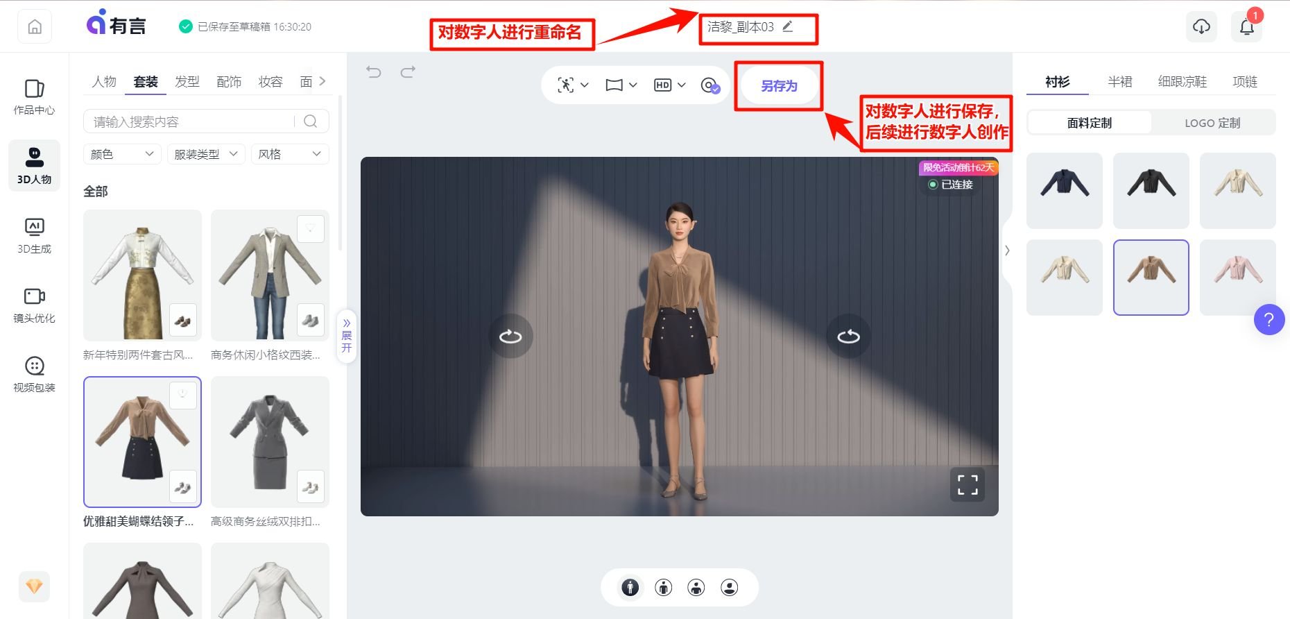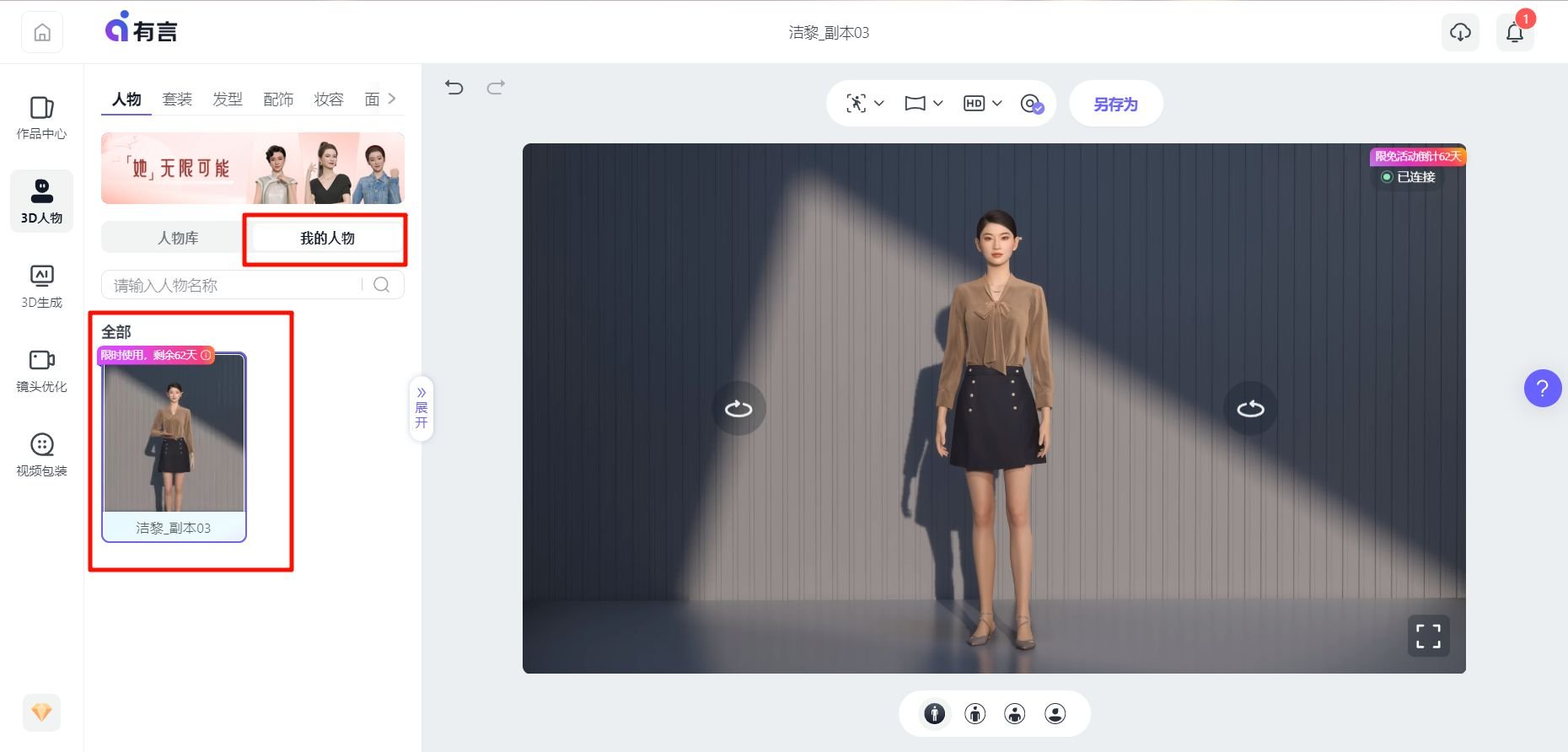 将细节调整好的数字人进行重命名和保存,保存之后的数字人会在左边列表我的人物中出现。