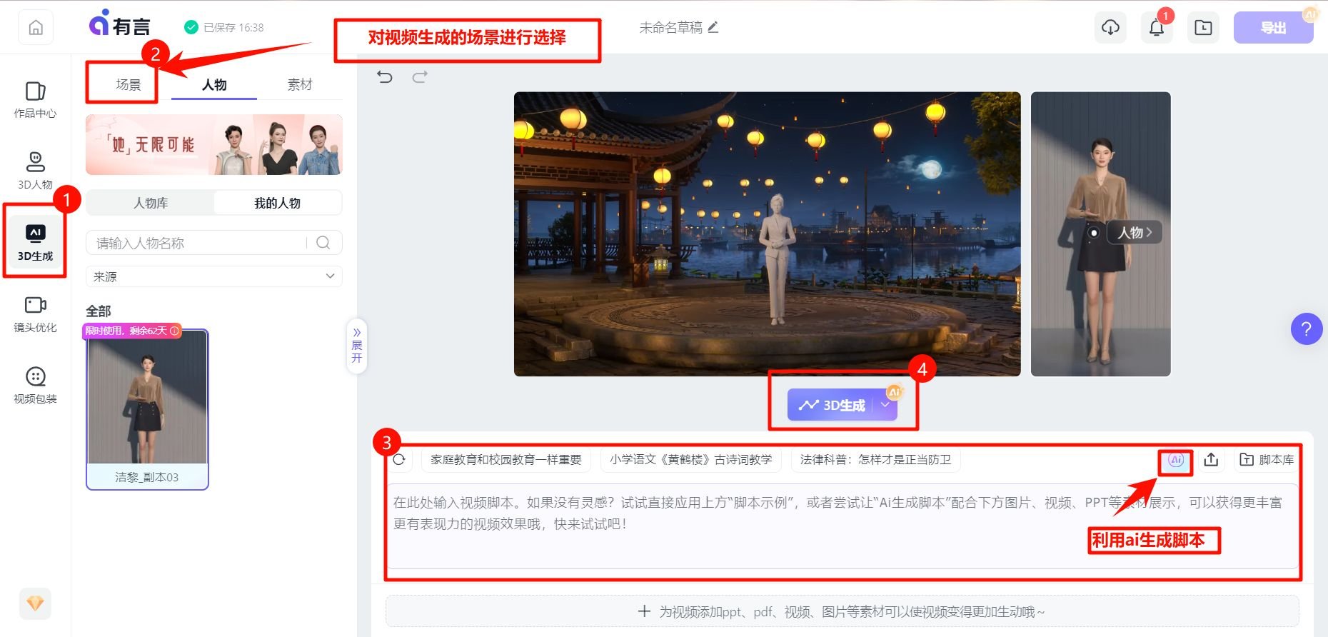 根据操作1选择3D生成,这一步就很关键数字人的使用全靠这一步操作。选择之后如下图,对场景可以进行选择,步骤看2。选择好合适的场景之后,就可以开启视频生成创作了。