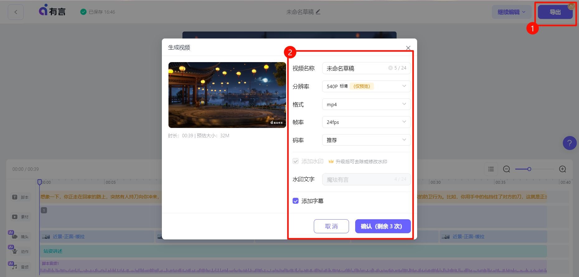 确定视频达到满意的效果之后,就可以点击右上角的导出对视频进行保存。这里支持视频分辨率和帧率的调整。