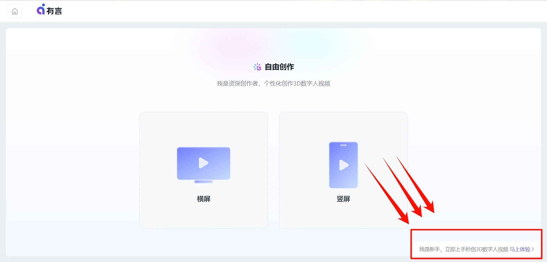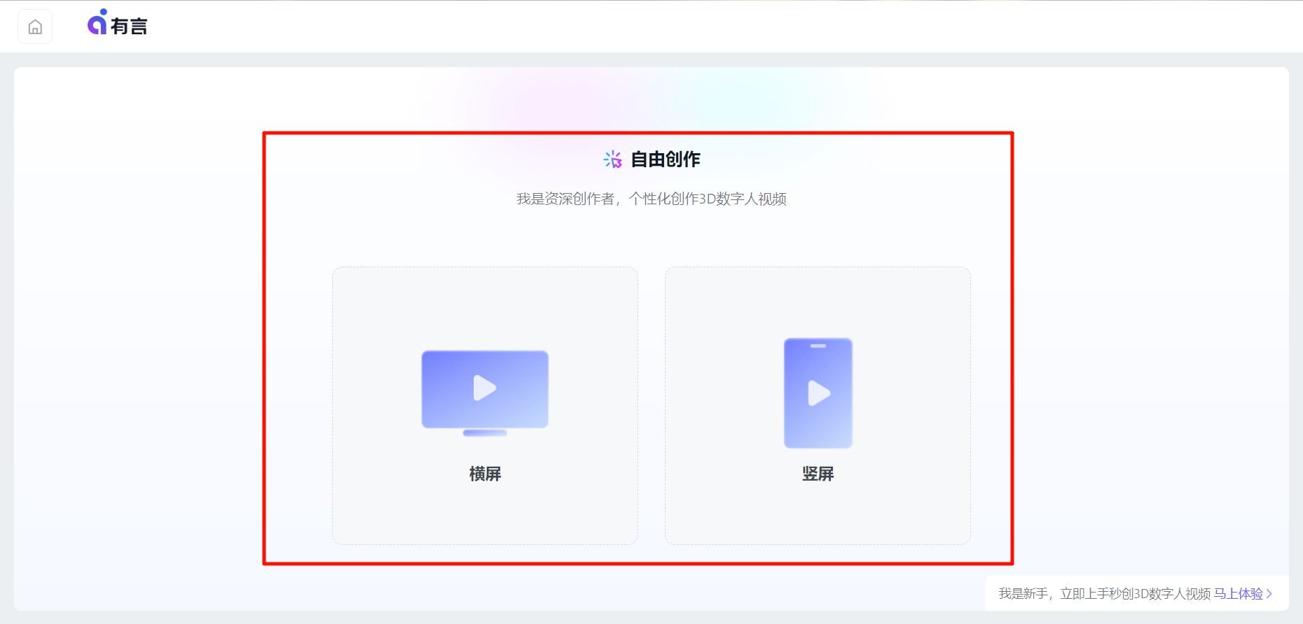 1、有言ai中制作数字人上分为2种模式,自由创作和快速生成,对应对数字人不同需求的用户。这一点明确的划分,让、工具的针对性更强,优化了繁琐的建模调整,轻松让小白也能上手生成专属的数字人模型。