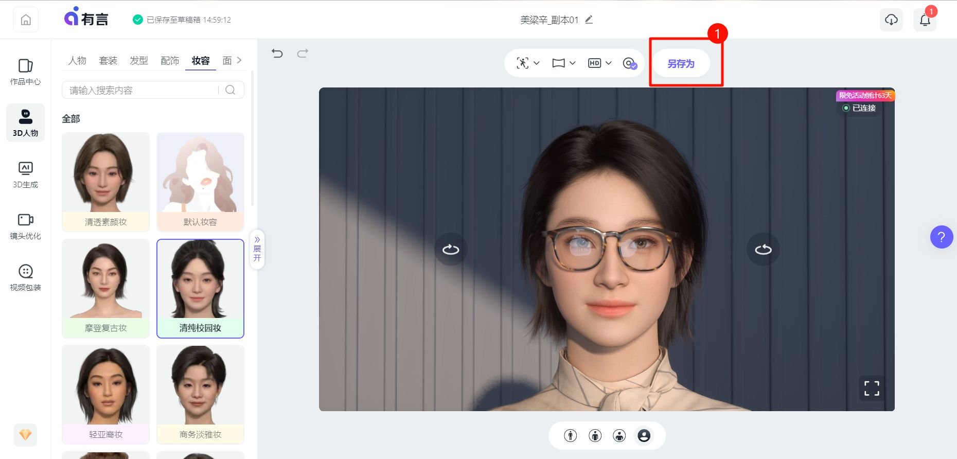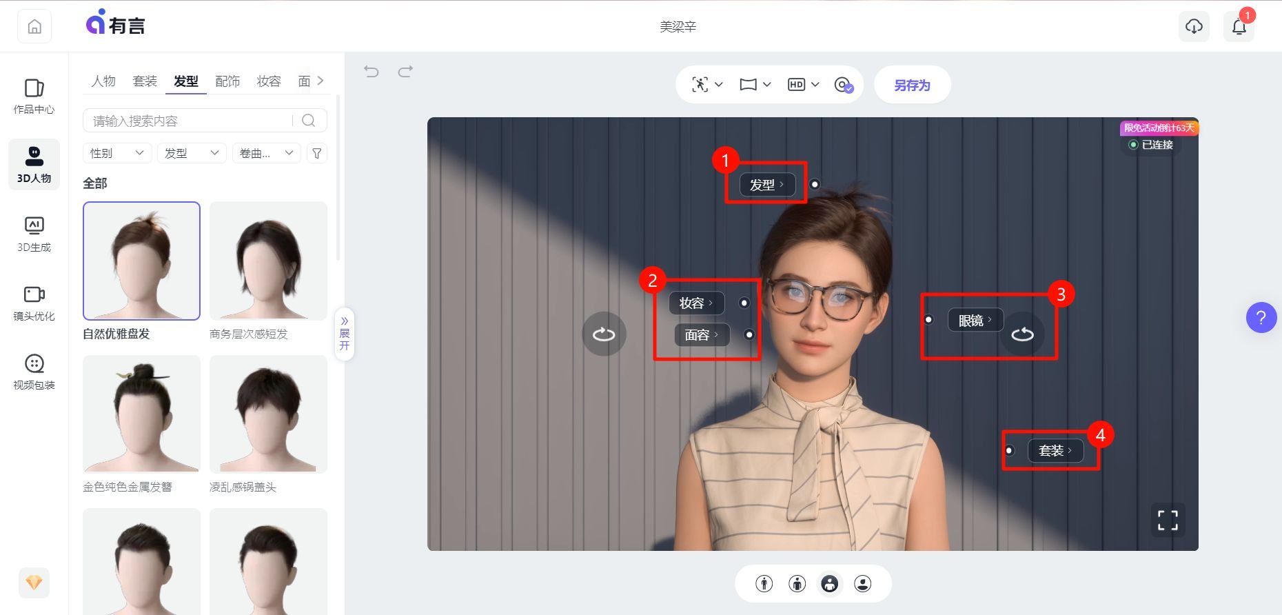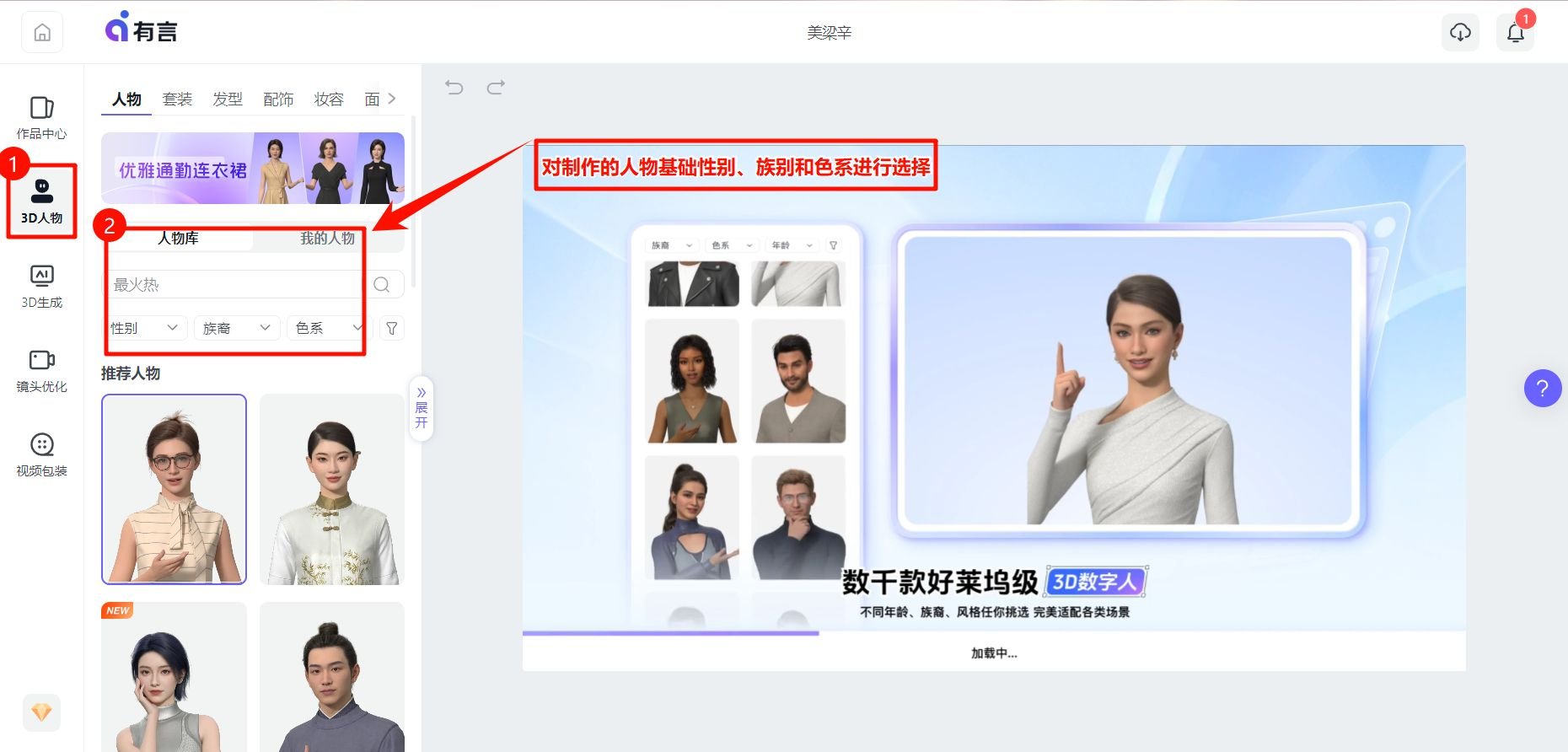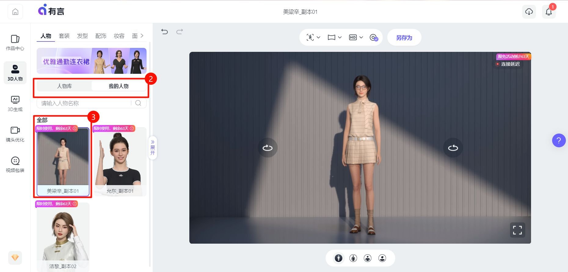 4、对调整好的数字人进行步骤1的保存,在左边步骤 2 的地方选择人物,之后就可以可以看见用户生存的数字人了,列如步骤3.