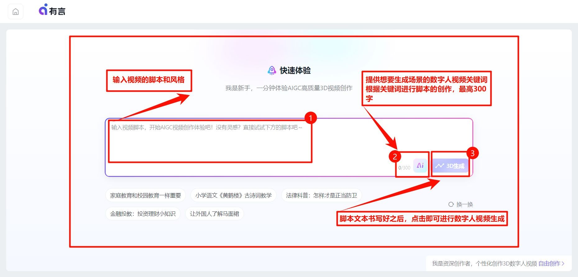 2、这个模式需要用户自己填写脚本和风格,没有对应的灵感可以点击右下角的ai提供关键词快速生成300字视频脚本。最后确定无误之后选择3D生成,只需要十几秒一个3D数字人视频就制作完成。