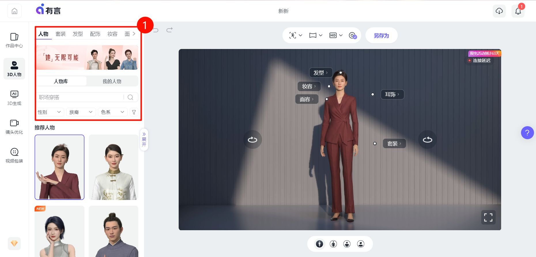 3、3D人物就是用户要创建的数字人了。可以根据需求对人物的性别形象进行选择,目前素材库中有500多的人物模板可以选择。