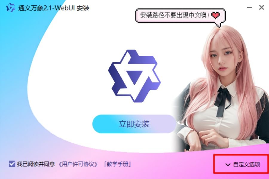 3-3、进入安装页面后,选择[自定义选项],将文件默认保存路径更改为除C盘以外的其他盘,修改完成后点击[立即安装],等待安装即可,安装速度取决于你的硬盘读写速度,一般5-60分钟左右即可安装完成。若中途未出现报错情况,仅需耐心等待即可。