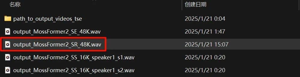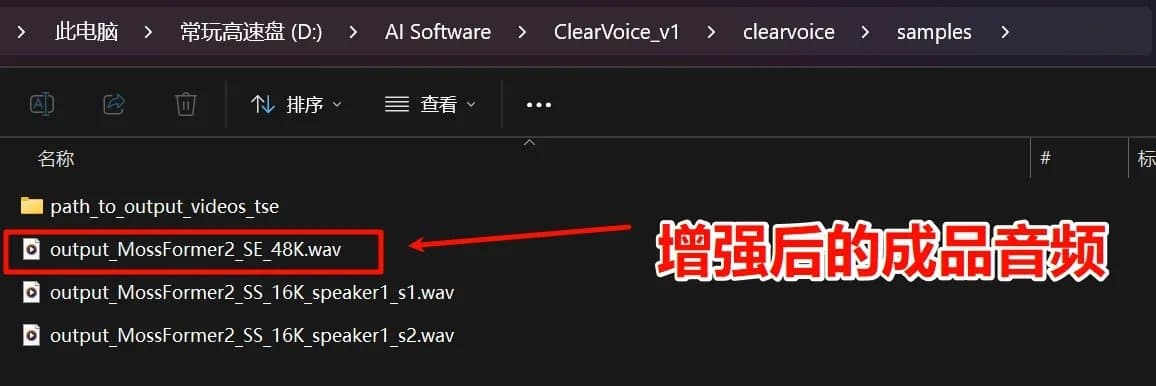⑤进入输出文件夹后,双击打开[output_MossFormer2_SE_48K.wav]即可试听增强后的音频,保存则需拷贝至其他文件夹,若重新处理会直接覆盖该文件。