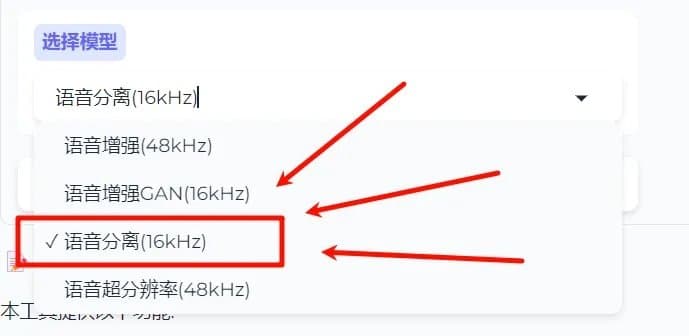 ①选择模型:模型选择为[语音增强(48kHZ)]或[语音增强CAN(16kHZ)],建议选择[语音增强(48kHZ)],输出效果更好,如果原采样率为48khz,输出则不会变,如原采样率为16/44kHz,选择48kHZ,会重采样为48kHz,实测效果提升明显。