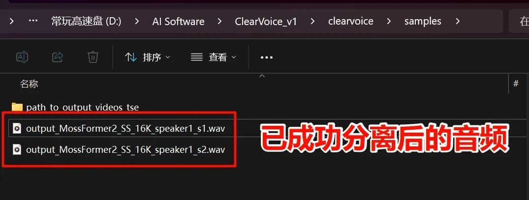 ⑤进入输出文件夹后,可以看到以下两段音频文件,[output_MossFormer2_SS_16K_speaker1_s1.wav]、[output_MossFormer2_SS_16K_speaker1_s2.wav]分别为已分离出来的两段人声,双击即可试听播放,如需保存,可将两段音频拷贝至其他文件夹,每次分离新的音频,都会直接覆盖音频文件。