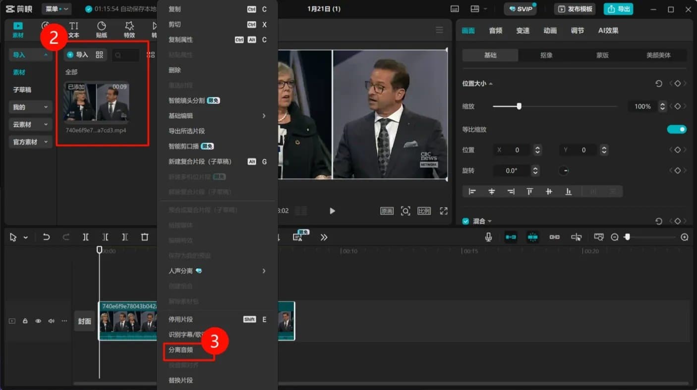 ②导入需要处理的视频,同音频处理模式,人声不能超过两人。