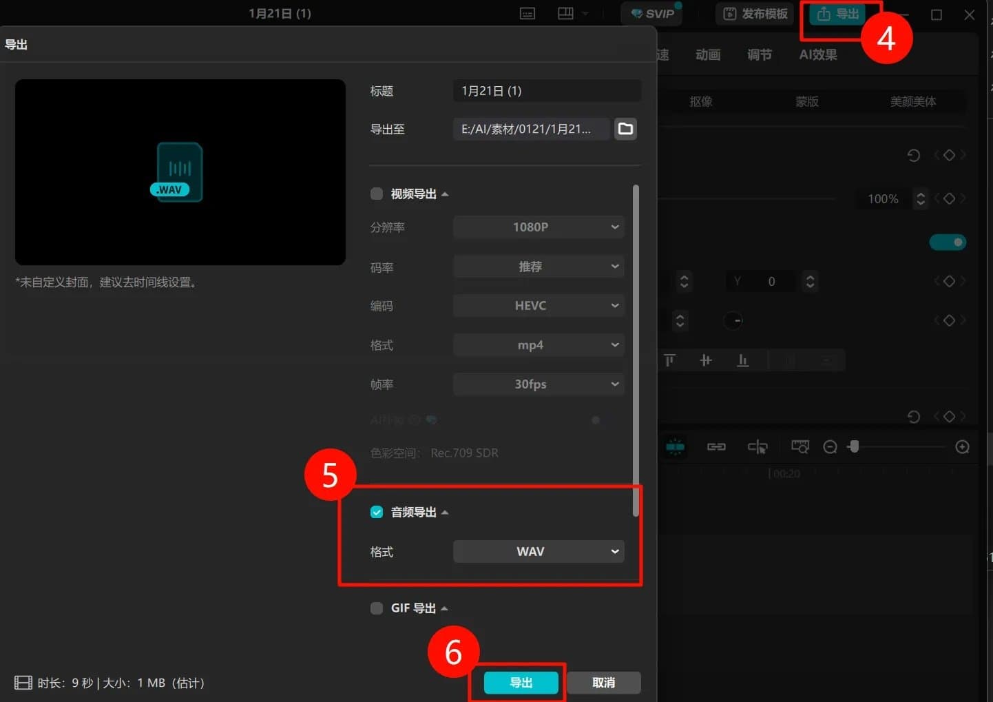 ④点击右上角导出,勾选音频导出选项,导出格式选择wav格式后,进行导出。