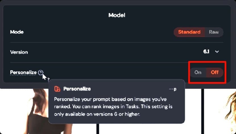 Personalize个性化这里选关闭,因为它和你账号的数据强相关,你只有在midjourney上面对很多图片点了赞之后,它会根据你点赞的喜好来生成图片,否则无法使用。