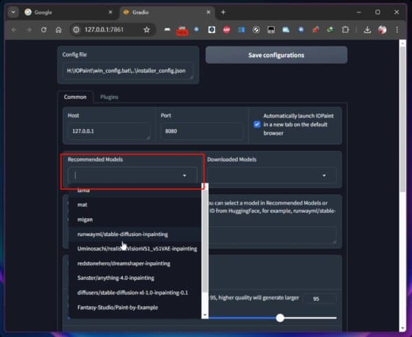 1、在WebUI中选择”recommended models”,挑选一个模型作为的默认选项。若你选择的是未下载的模型,程序会在你下次启动IOPaint时自动下载该模型。